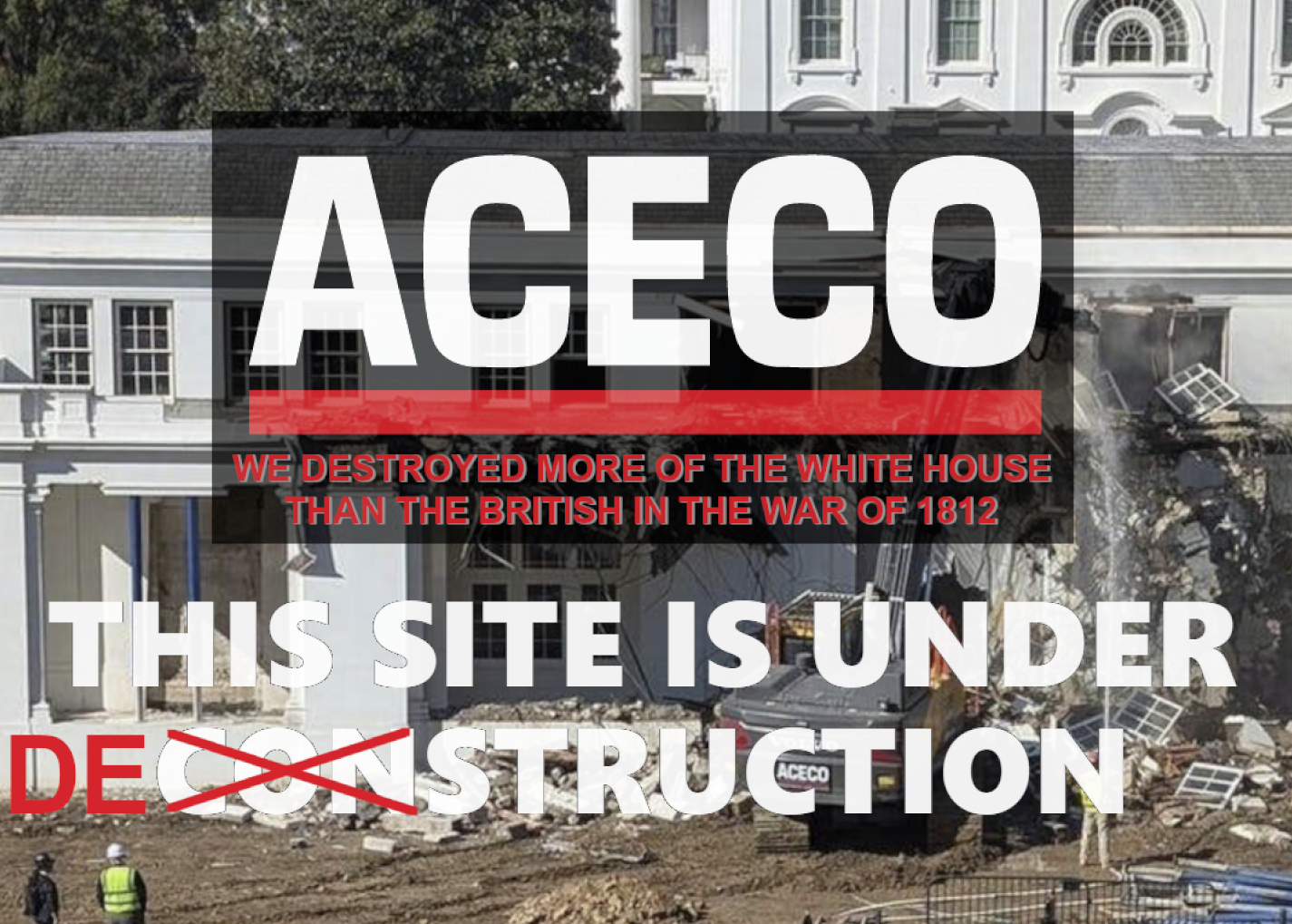 Image of the destruction of the East Wing of the White House with a screenshot of the website of Aceco, the company carrying out the demolition, which is currently showing "Under Construction." It has been edited so that "Con" in "Construction" is crossed out with a red X and "De" added at the beginning. "Redefining Demolition" under the company name has been replaced with. "We destroyed more of the White House than the British in the War of 1812."