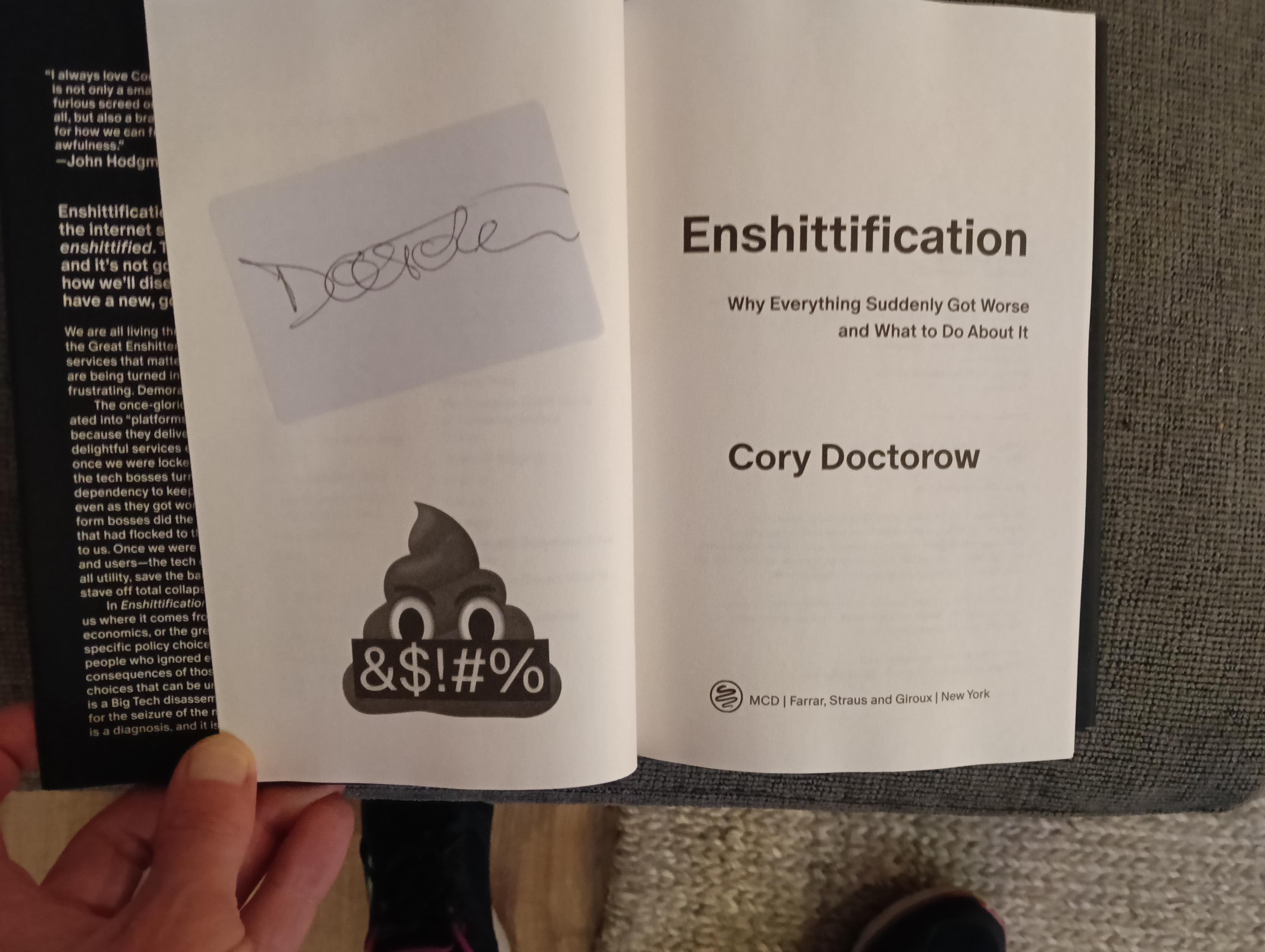 And now, thanks to @plambrechtsen his genius idea of asking @pluralistic to sign some sticky labels, I have a signed copy of #Enshittification.