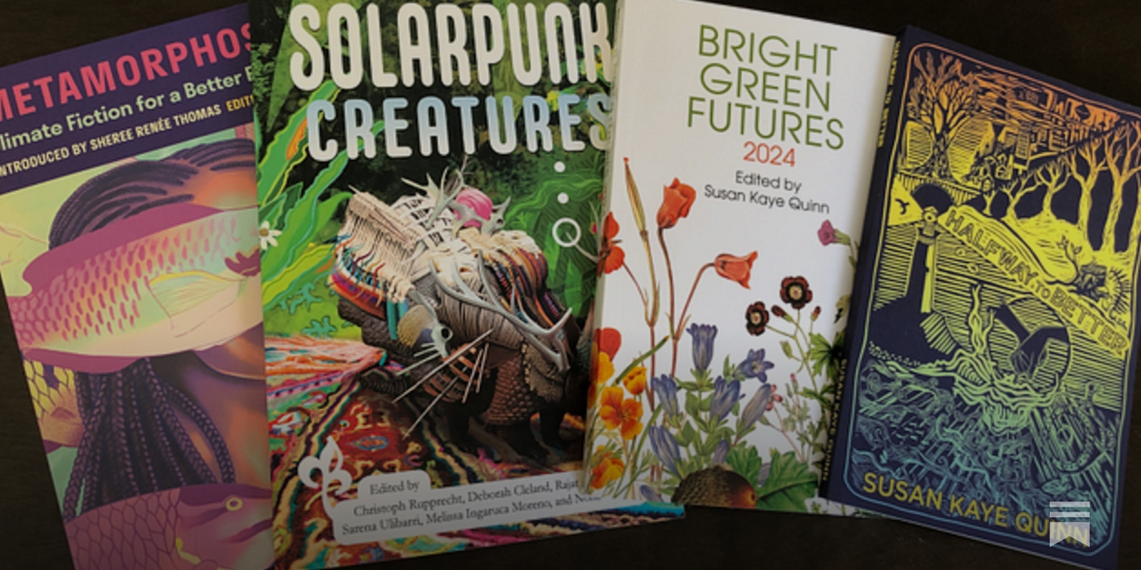 Video showing 8 page zine Pg 1: How to Solar Punk with a sun icon Pg 2: Reduce, reuse... with "no plastics" icon and "circular economy" icon Pg 3: Rewild... with butterfly icon and hand with sprout icon, "Repair" with crossed tools icon and needle-and-thread icon Pg 4: Rethink, reimagine... with lightbulb/brain icon and electrified house icon Pg 5: Re-organize with bullhorn icon, equality of people icon, and voting icon. Pg 6:Recalculate costs with CO2 icon and smokestack icon, "Redistribute wealth" with money icon dispersing with arrows. Pg 7: Resist, resist, resist, with protest icon. "Revolutionize." with hand holding scales of justice icon Pg 8: Regenerate. With mushroom icon and sun over sprouts icon. At end, camera moves to show curious calico kitty. BrightGreenFutures.wtf