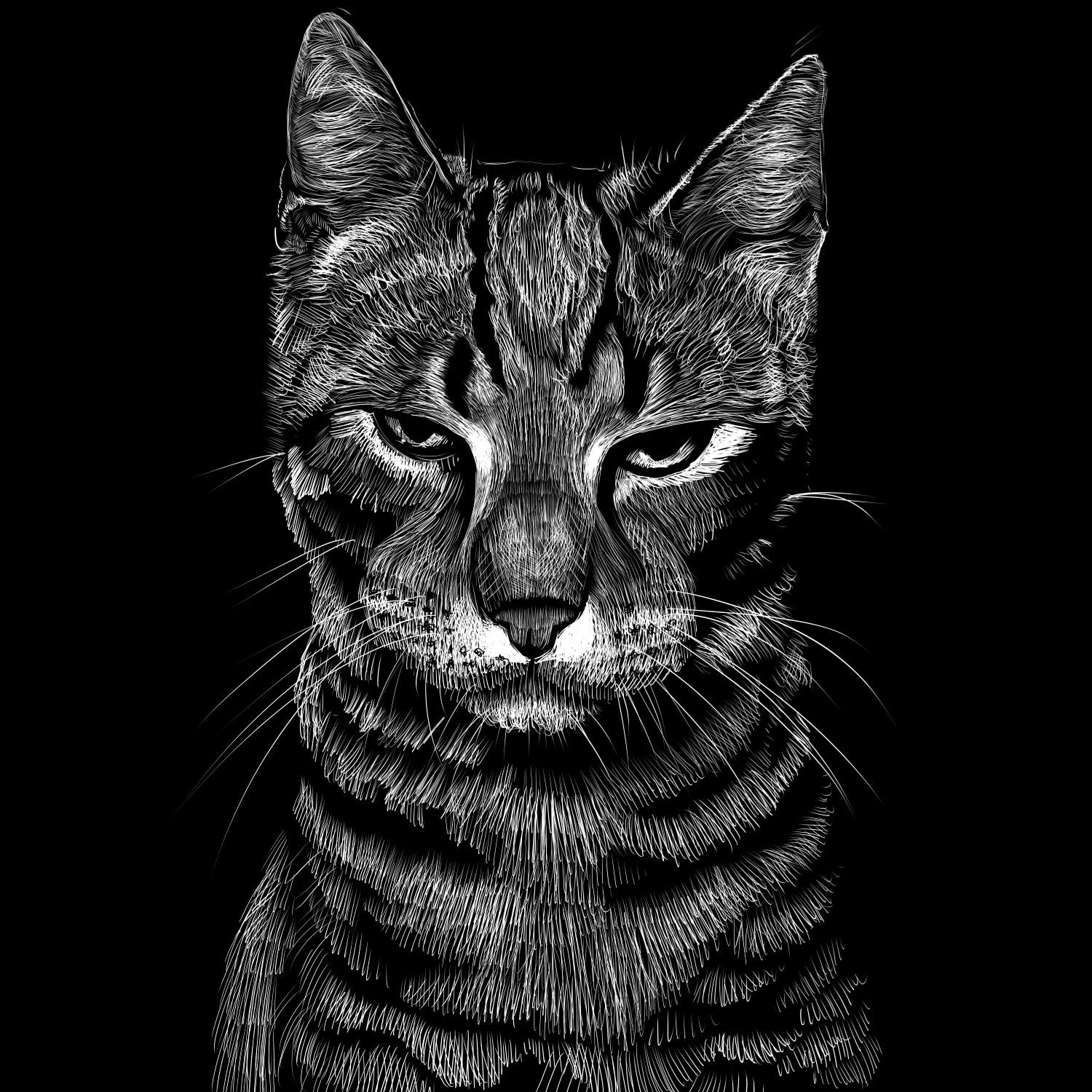 A digital drawing of a tabby cat, white on a black background, drawn in the style of a scratchboard picture. His eyes are half closed, which is usually a good sign that a cat likes you, but in this case it makes him look pretty badass.