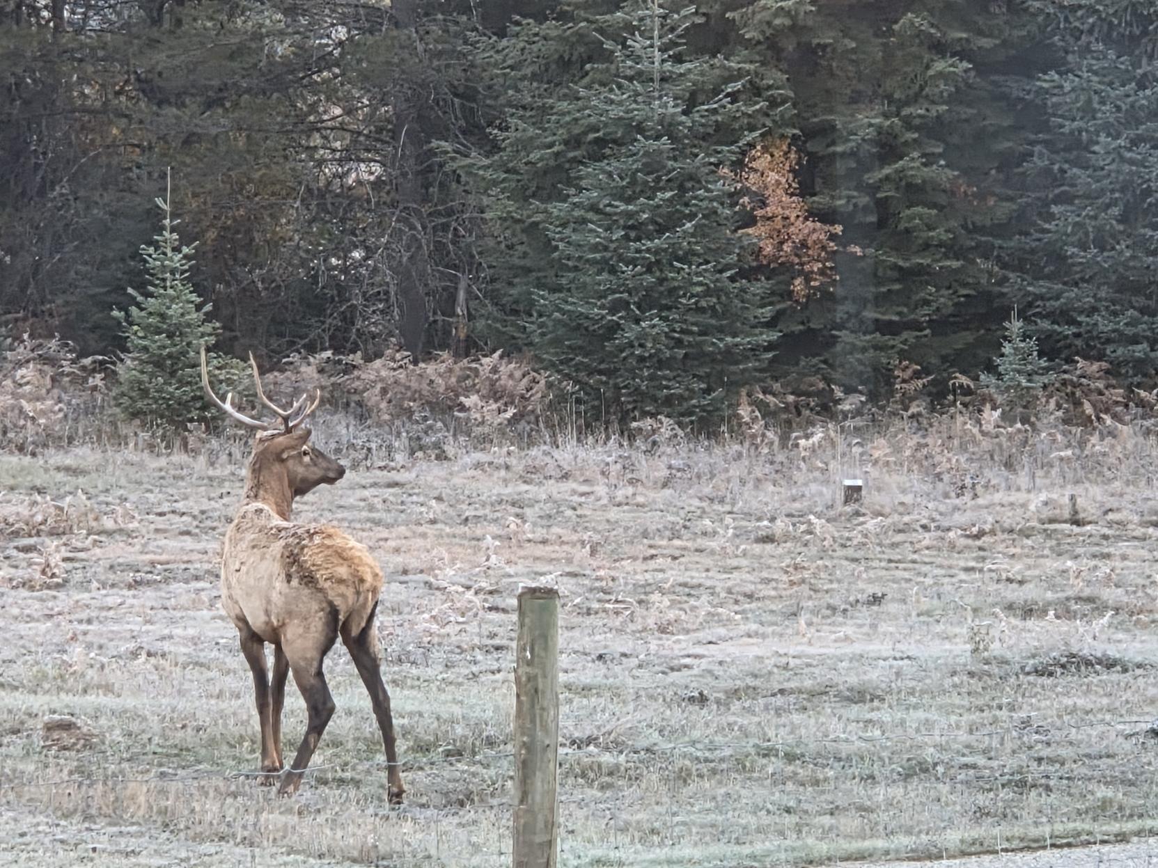 A lone elk buck with a substantial rack, staring off to the right with his flank to the camera. There is a fence post in the foreground and a cops of trees in the background. The grass is a pale yellow, but the trees are vibrant greens and dark copper.