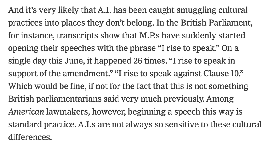 And it's very likely that AI has been caught smuggling cultural practices into places they don't belong. In the British Parliament, for instance, transcripts show that MPs have suddenly started opening their speeches with the phrase "I rise to speak". On a single day this June, it happened 26 times. "I rise to speak in support of the amendment." "I rise to speak against Clause 10." Which would be fine, if not for the fact tat this is not someting British parliamentarians said very much previously. Among *American* lawmakers, however, beginning a speech this way is standard practice. AIs are not always so sensitive to these cultural differences.