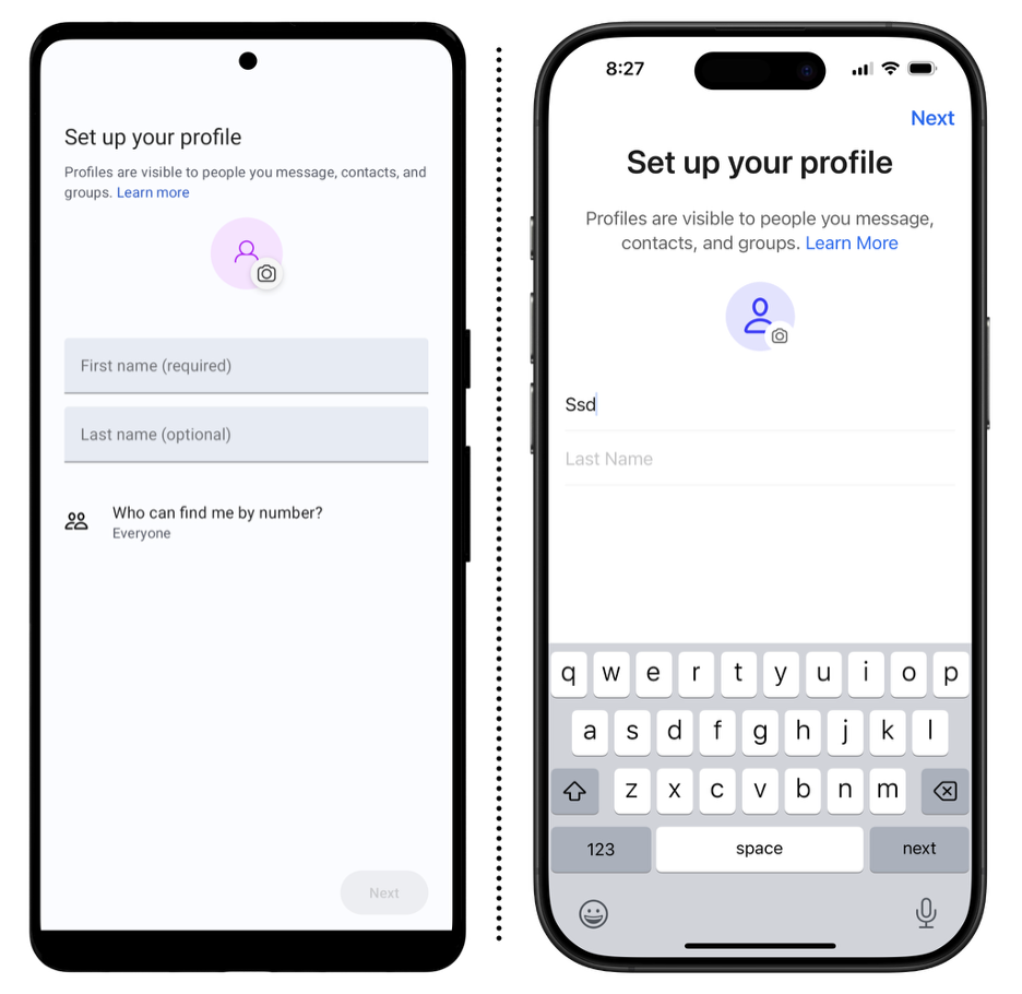 Screenshots of the Signal profile set up on phone mockups. Text reads: "Set up your profile: Profiles are visible to people you message, contacts, and groups."