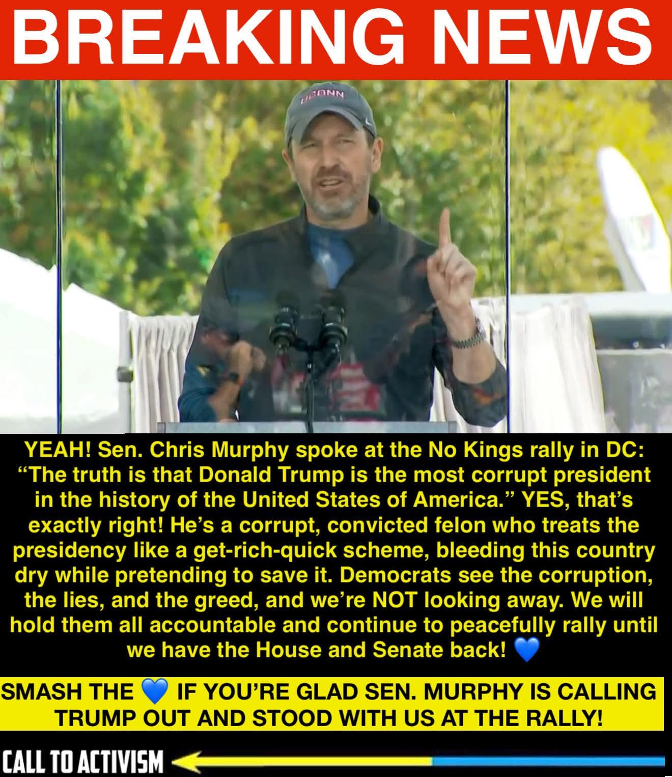 Alt Text: Image of Senator Chris Murphy speaking passionately at a podium during the “No Kings” rally in Washington, DC. He’s wearing a UConn cap and holding up one finger while addressing the crowd. Above him is a bold red “BREAKING NEWS” banner. Below the image is a yellow and black text box quoting Murphy calling Donald Trump “the most corrupt president in the history of the United States of America,” criticizing Trump’s greed and corruption, and calling for accountability. Description (Context): Sen. Chris Murphy delivered a powerful speech at the No Kings rally in DC, denouncing Donald Trump’s corruption and rallying Democrats to stand united. The post highlights his words, emphasizing the urgency to hold Trump and his allies accountable and energize the movement to win back the House and Senate.