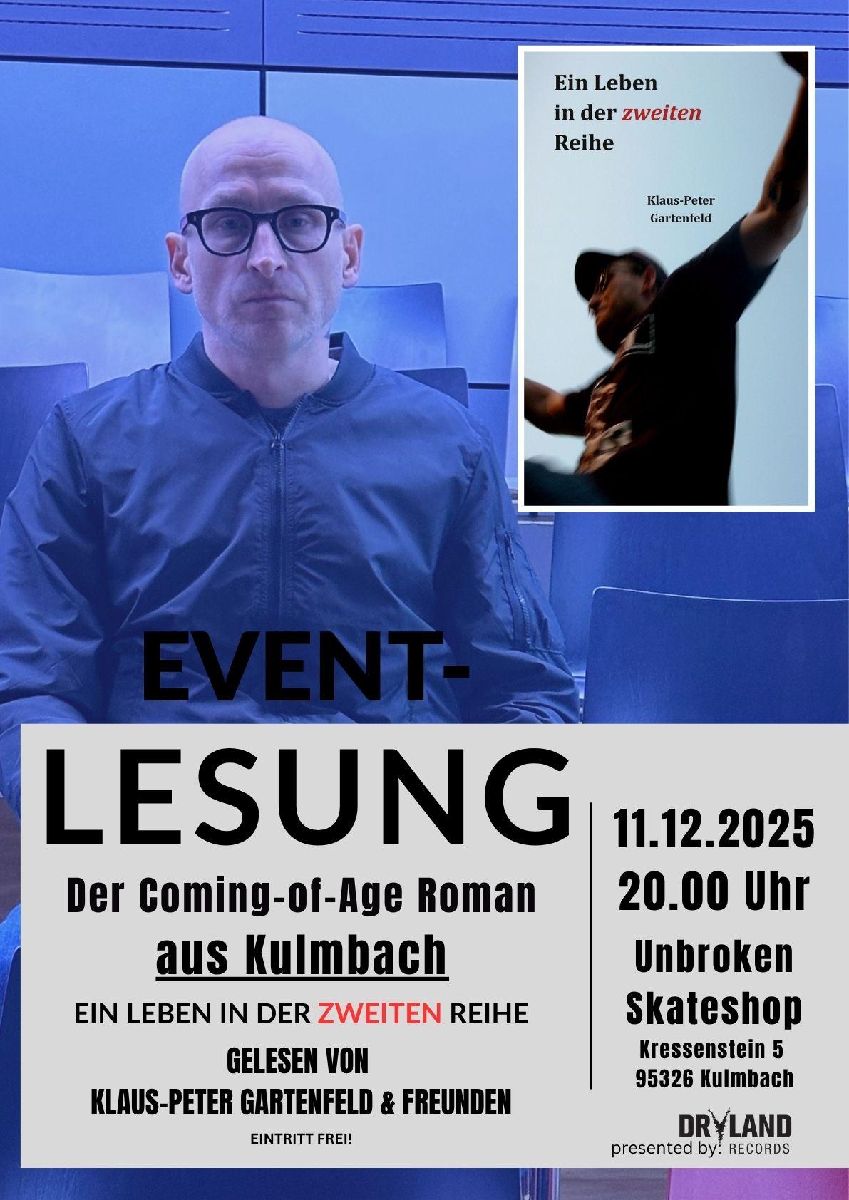 Klaus-Peter Gartenfeld und Dryland Records präsentieren eine unorthodoxe Event-Lesung zum Musikroman "Ein Leben in der zweiten Reihe"! Das Buch hat mittlerweile zahlreiche Fans gefunden, die schon viel zu lange auf eine derartige Veranstaltung warten, weshalb man sich etwas ganz Besonderes einfallen ließ. Gartenfeld wird von illustren Gästen unterstützt, die mit ihm zusammen das Werk vorstellen. Dazwischen gibt es kleine Gesprächsrunden, in denen man über Musik, Subkultur etc. plaudert. Punkrock meets Lesung!