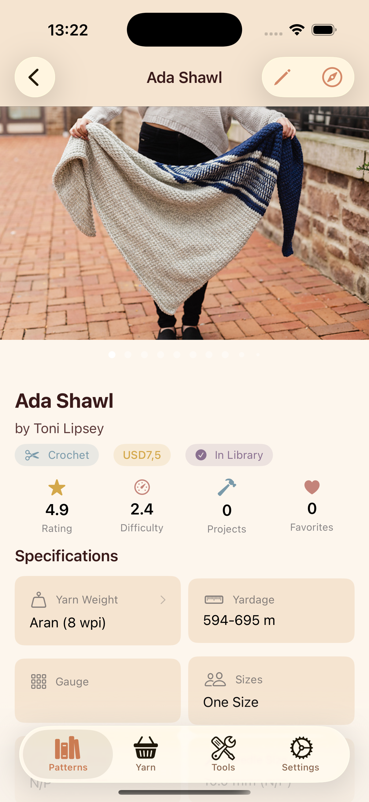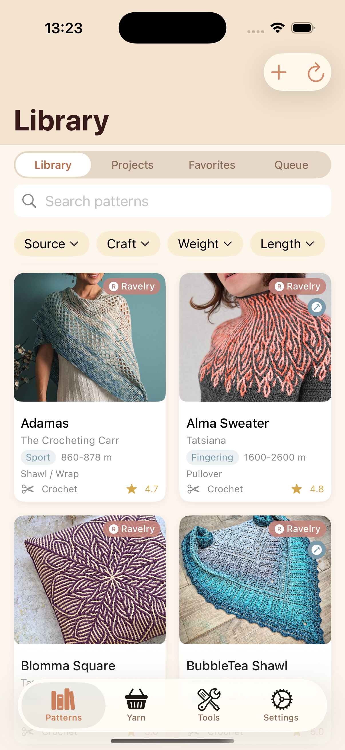 Screenshot of an iOS app. It shows a library view with crochet patterns. There is some information shown for each.
