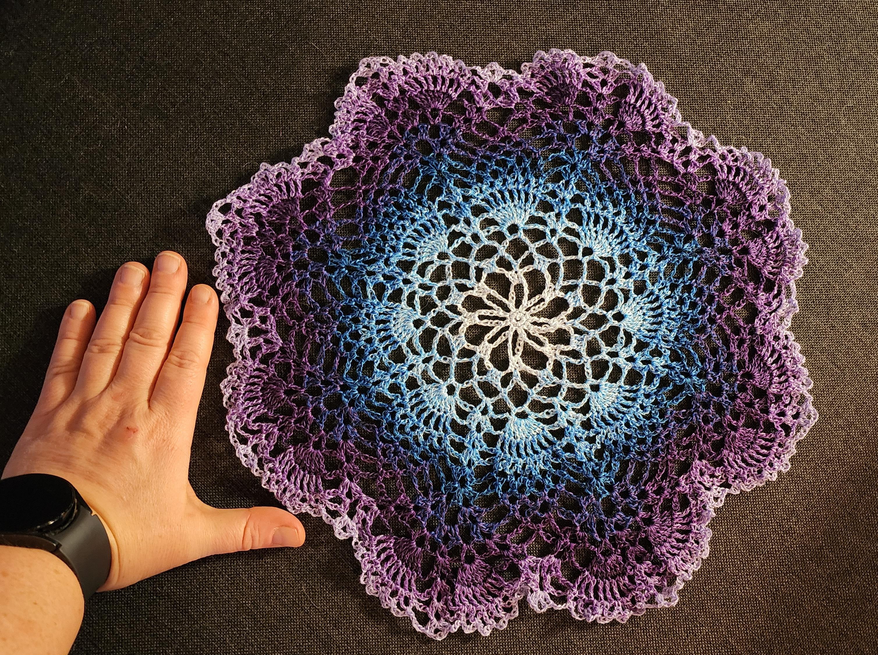 A crocheted doily that's light blue in the middle, graduating to darker blue, purple, then light purple. My hand is next to it for scale.