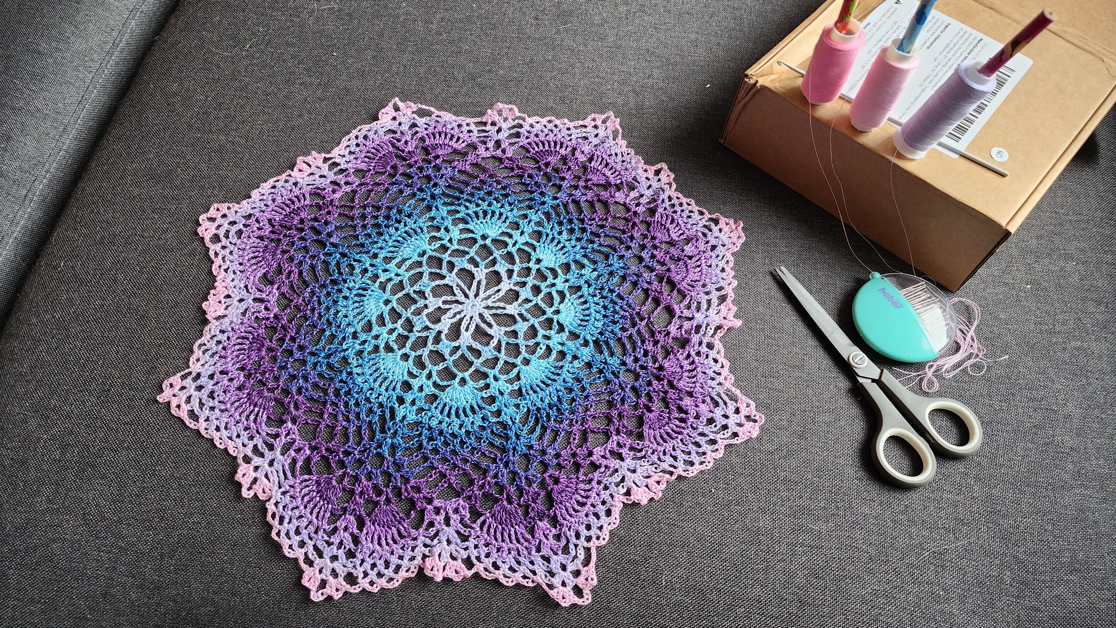 A crochet doily spread out on a sofa next to a scissors, a case of sewing needles, and some spools of thread. The doily is big and intricate, with pineapple shapes in the pattern, crocheted with blue in the middle graduating to dark blue, purple, lilac, and now going into pink around the outside.