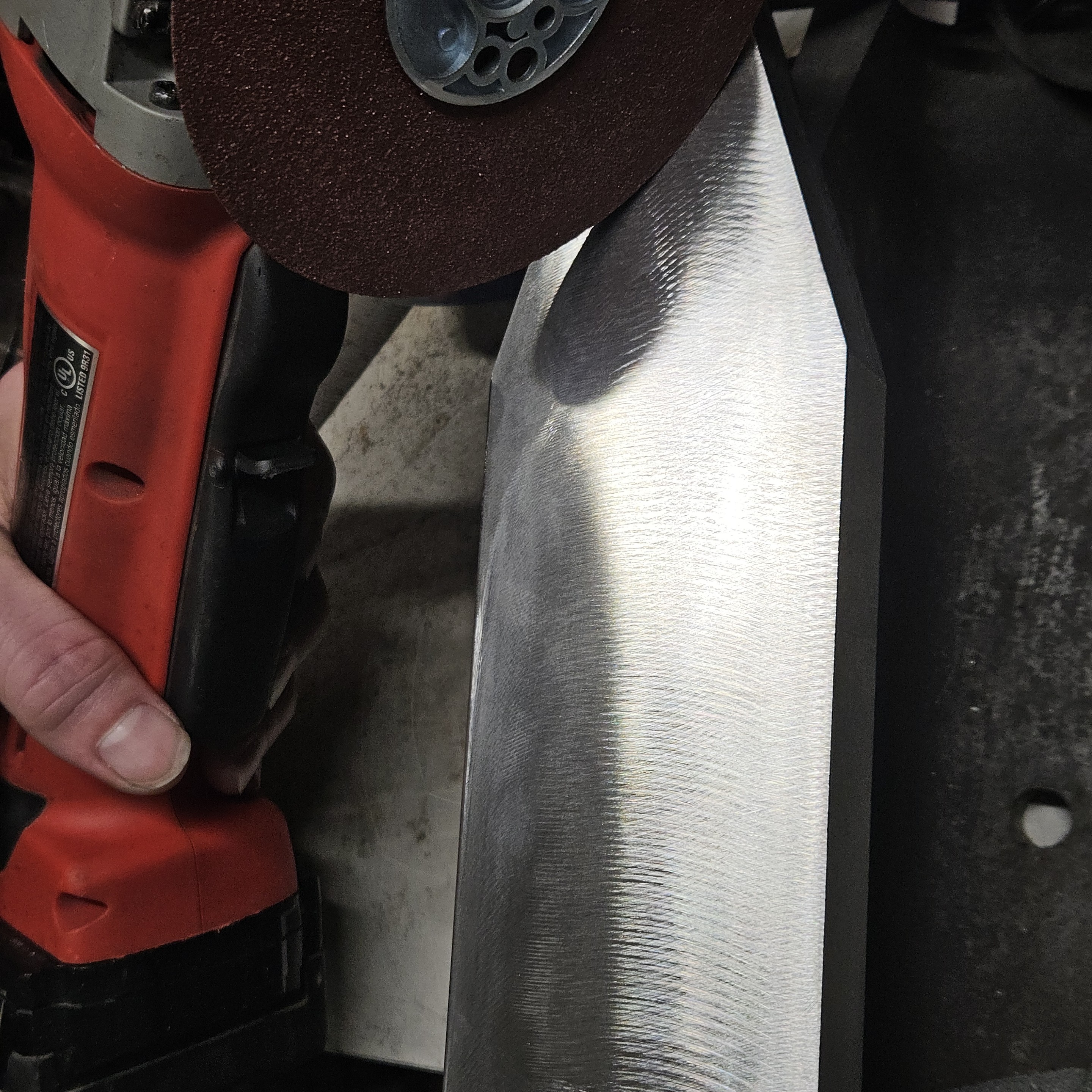 Hand milling the finish on this railroad rail, turned finishing anvil. It was done with a slotter style mill, so had some deep grooves. These 80 grit metal finish wheels with flexible backing are THE ticket here. It gives fine control of the surfacing, the lighting is the second key. The light shows you where you've been. whoa. thats some #heavymetal. #alttext #alttextbonus #anisotropy