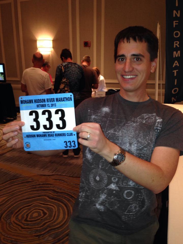 A photo of a white person who was pretending to be a man (she didn’t realize things yet) who had short brown hair, a black shirt, and is holding up a marathon race bib with the number 333 on it.