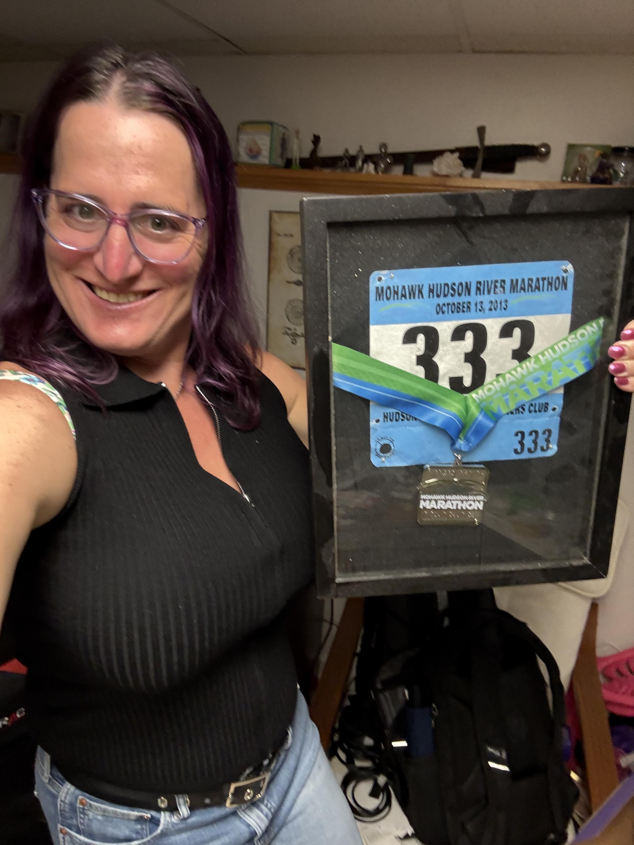 A selfie of a lady with shoulder length purple hair, purple glasses, a black sweater vest partially zipped down, holding a framed marathon race bib with the number 333 and a marathon finish medal.