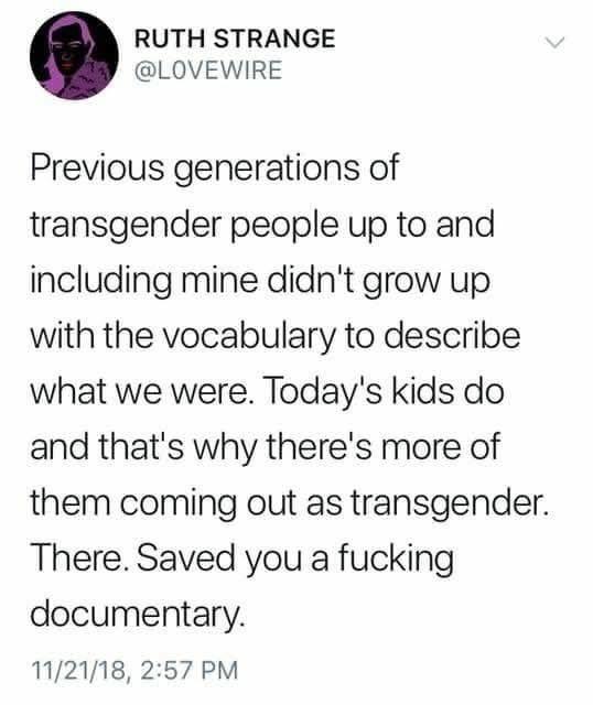 RUTH STRANGE @LOVEWIRE Previous generations of transgender people up to and including mine didn't grow up with the vocabulary to describe what we were. Today's kids do and that's why there's more of them coming out as transgender. There. Saved you a fucking documentary. 11/21/18, 2:57 PM