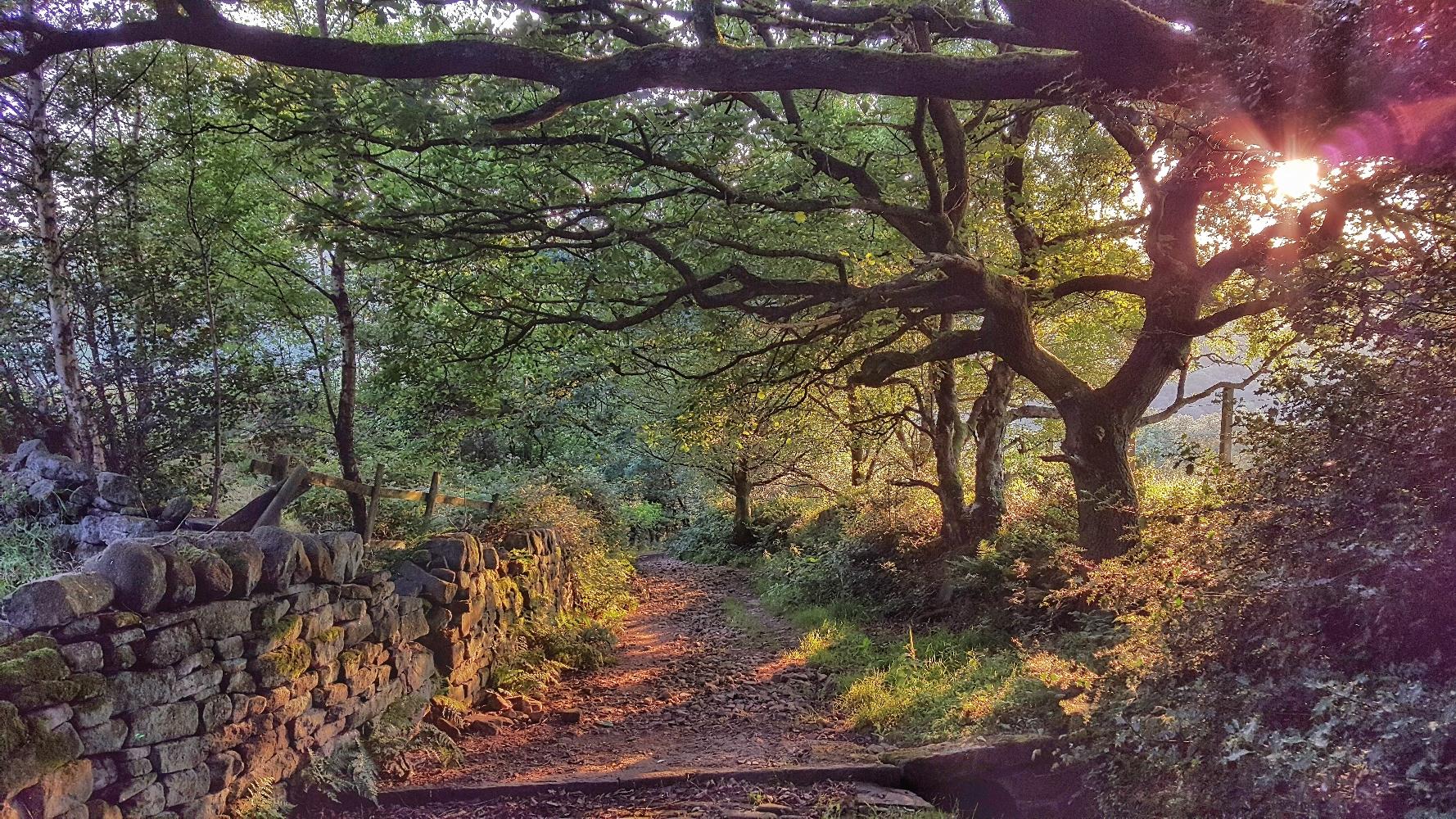Sunlight filters through a canopy of trees over a winding woodland path, with a mossy dry-stone wall running alongside the trail and warm golden-hour light flaring through the branches.