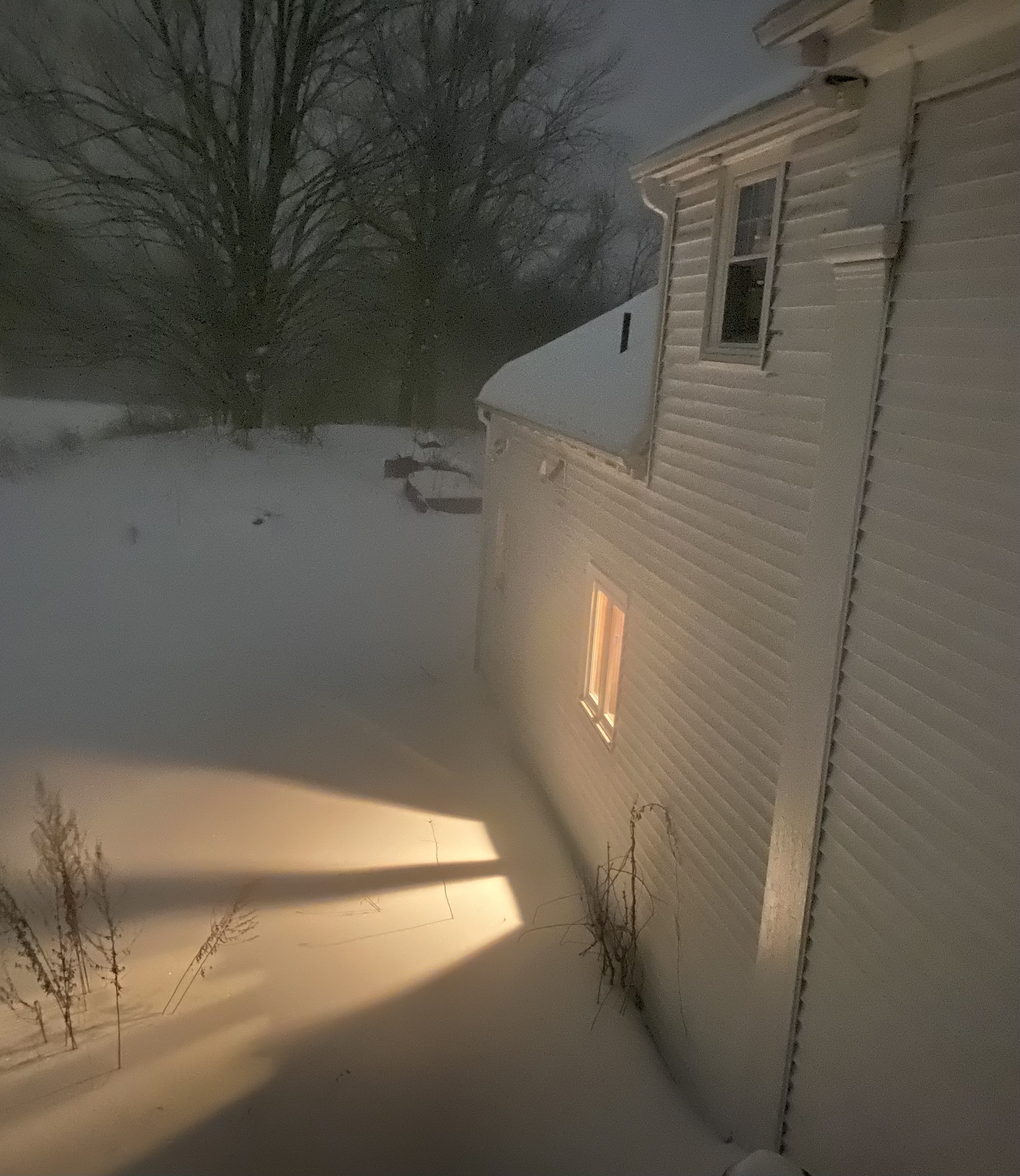 Fresh snow reflects soft, warm light from a window, the only one illuminated from what’s visible of the side of a house. Further in the distance are stark, barren trees in winter form. There is a bit of ambient light, cold in comparison to the window’s casting. The rest is level, fresh snow.