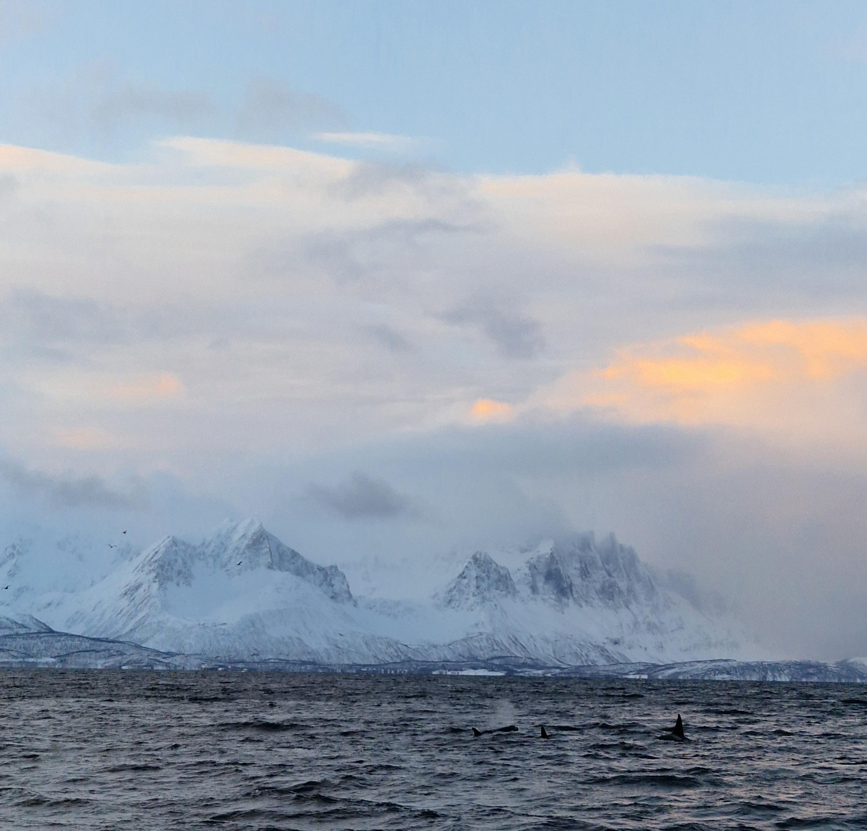 Seascape with orkas in a roughish dark grey sea. In the background dramatic high mountains covered in snow. The lower part of the sky is cloudy with a large yellow part (the sun is going down). The upper part is light blue. November in northern Norway.