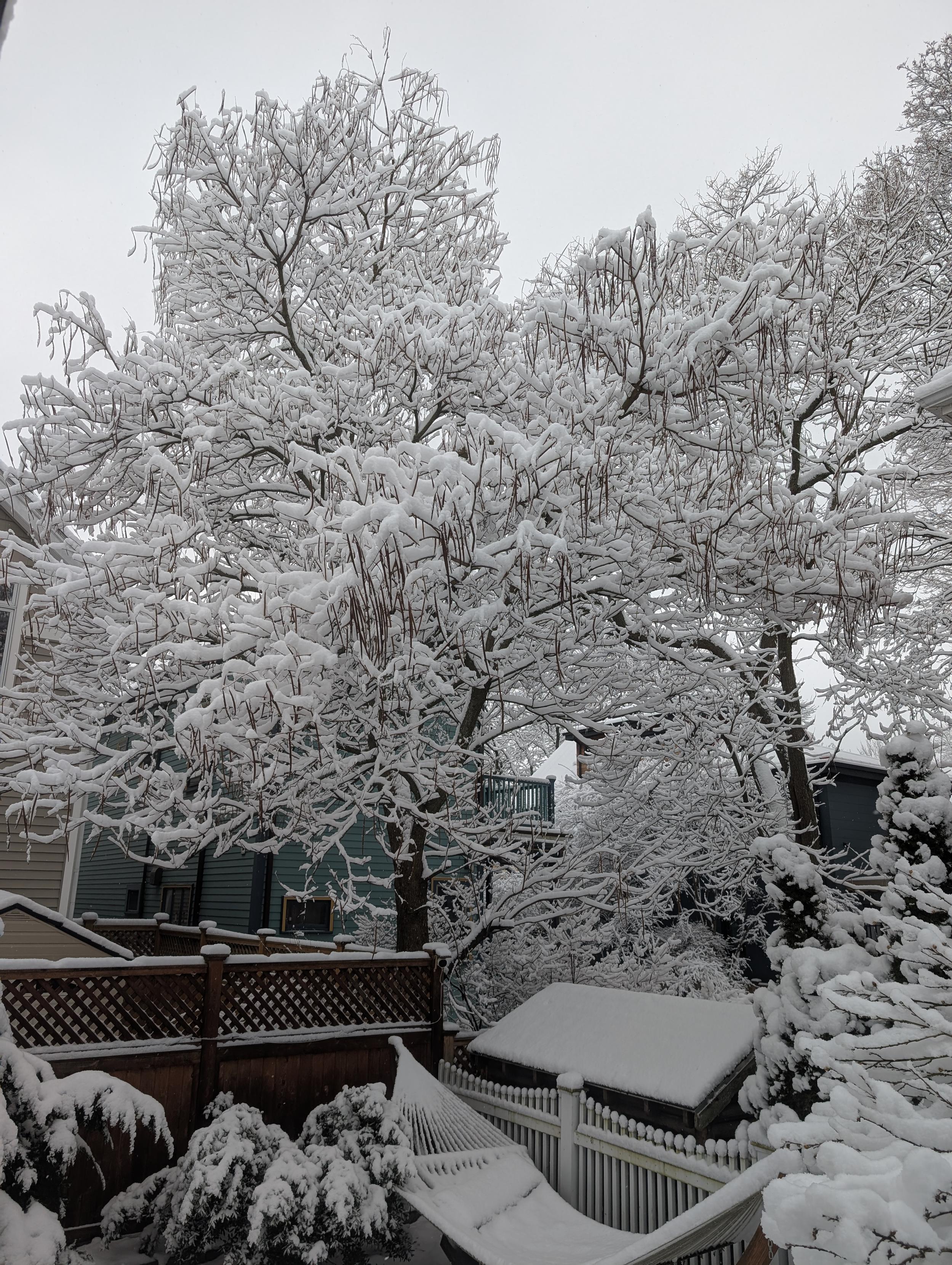 Catalpa trees with hanging pods covered with snow in a backyard (including a hammock we forgot to bring in)