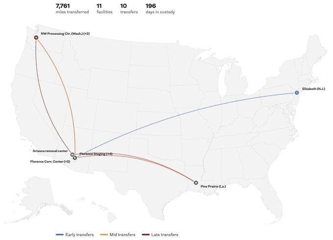 A Ghanaian man detained by ICE in NJ was tfr 10X over 196 days, trav 7,700+ mi.