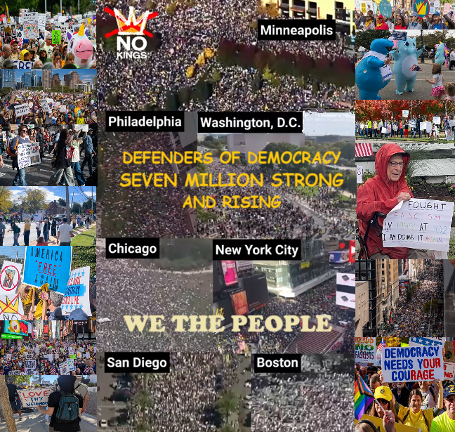 No Kings 2, the largest protest in US history is over, but the movement has just begun. Seven million Defenders of Democracy took to the streets to say this country belongs to We The People. 7,000,000 Americans. Young and old, rich and poor, black, brown and white, demanding our future will not be lived under tyranny.