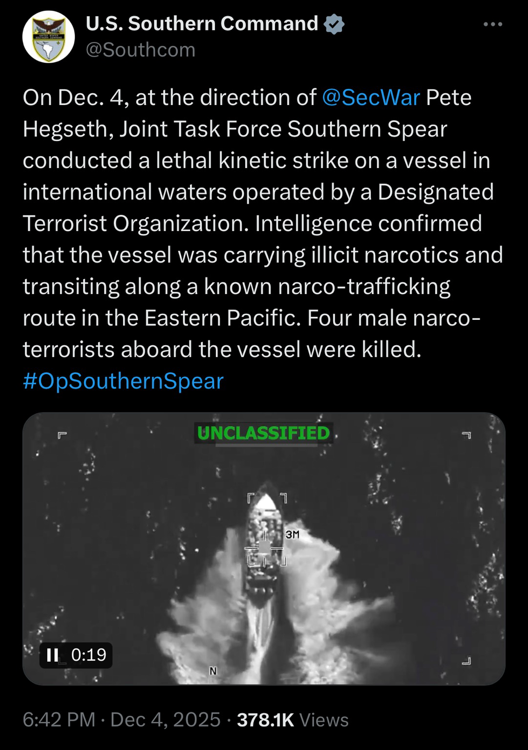 #US strikes another boat in the Eastern #Pacific, killing 4, amid escalating questions about its purported “counter-drug” offensive [ #oil acquisition / US #supremacy of the Americas]