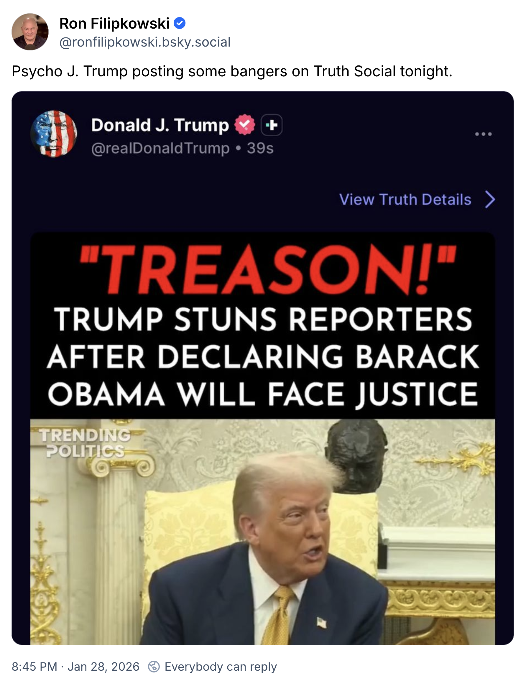 Ron Filipkowski @ronfilipkowski.bsky.social Psycho J. Trump posting some bangers on Truth Social tonight. Donald J. Trump @realDonald Trump View Truth Details "TREASON!" TRUMP STUNS REPORTERS AFTER DECLARING BARACK OBAMA WILL FACE JUSTICE