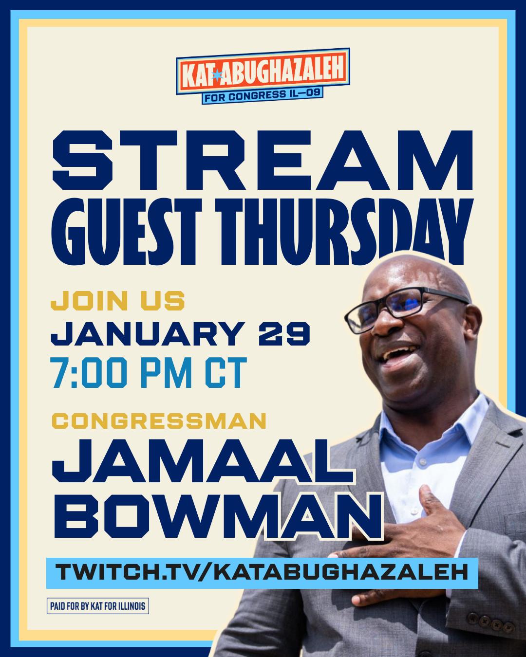 Campaign stream promotional graphic, highlighting our next guest Jamaal Bowman with a photo of him showcased. Copy reads: "STREAM GUEST THURSDAY JOIN US JANUARY 29 7:00 PM CT CONGRESSMAN JAMAAL BOWMAN! Join us on TWITCH.TV/KATABUGHAZALEH [ paid for by Kat for IL disclosure ]"