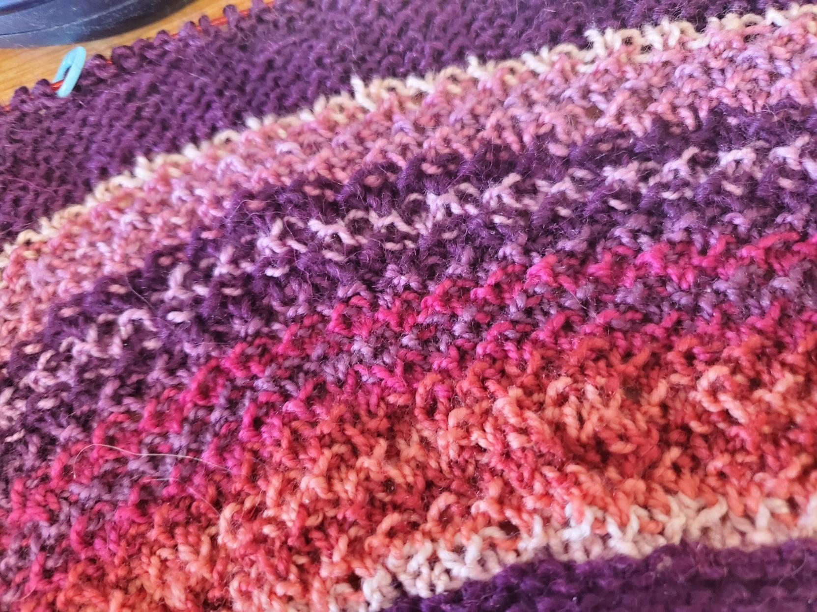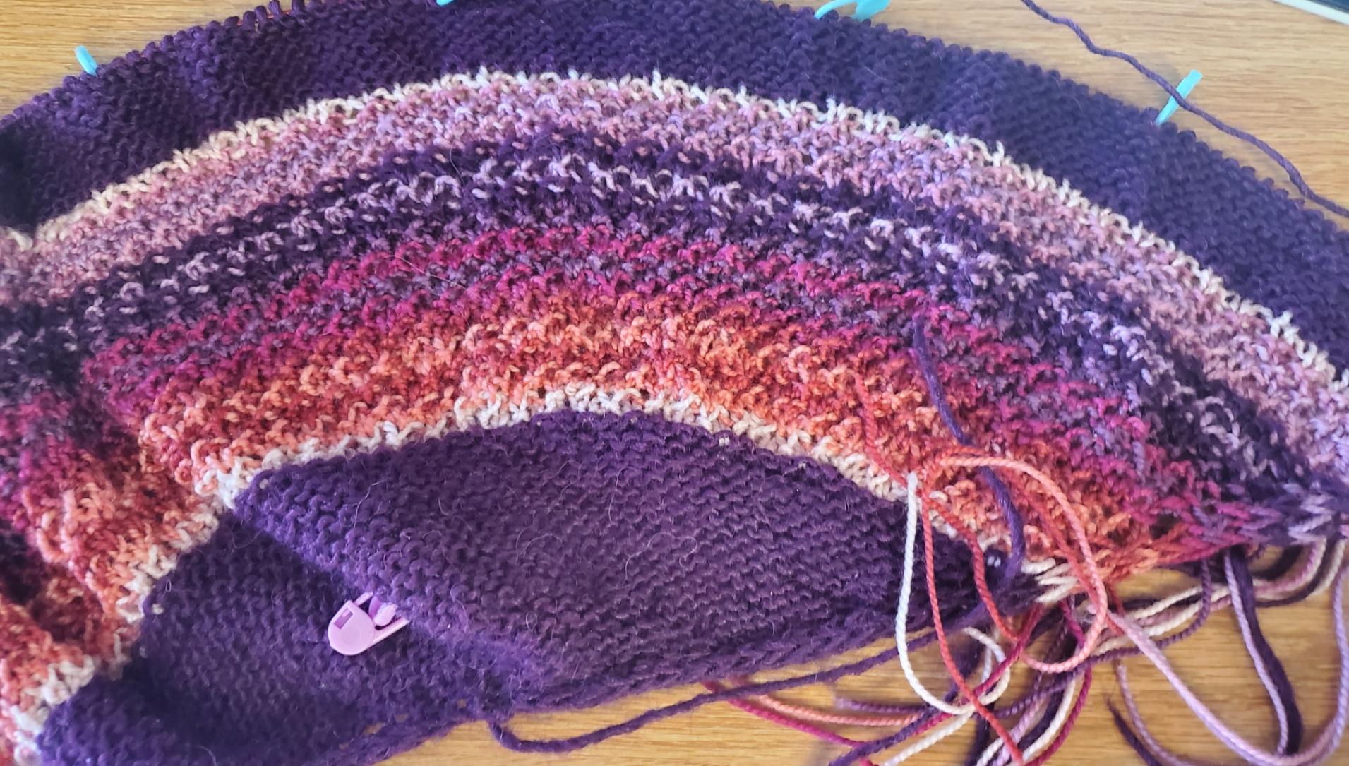 Started this new Stephen West shawl, #Icelandscape, only to realize I don't have enough yardage of colors, so am subbing in some solid sections which should work fine. It's good to have needles back in my hands, and to be back with all y'all!!