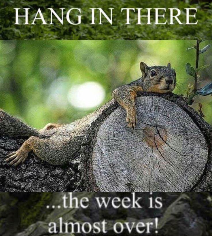 Picture a grey squirrel laid exhausted across the cut branch of a tree, the caption reads: “Hang on in there … the week is almost over”