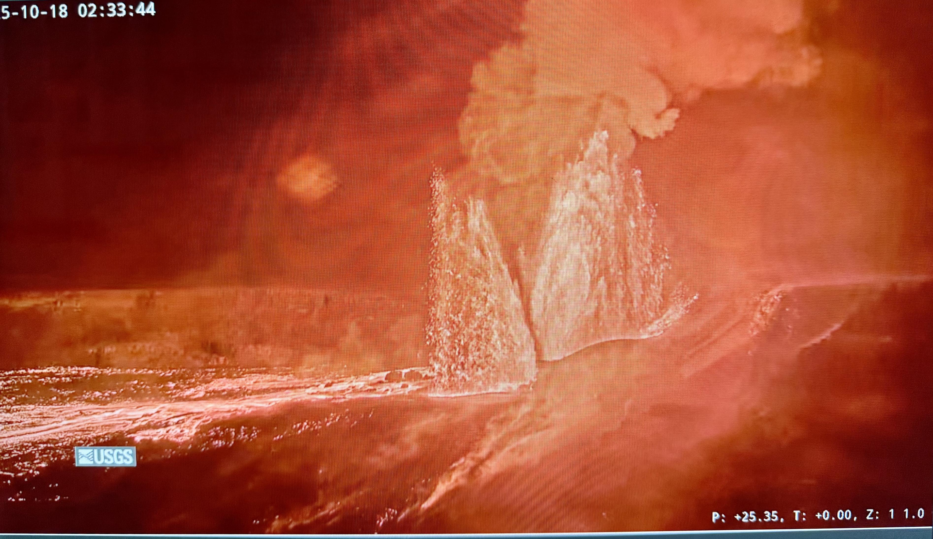 2 columns of lava erupt from Kilauea, with lava flows trailing off in all directions. It’s the middle of the night so the lava is extra brilliant against the black background.