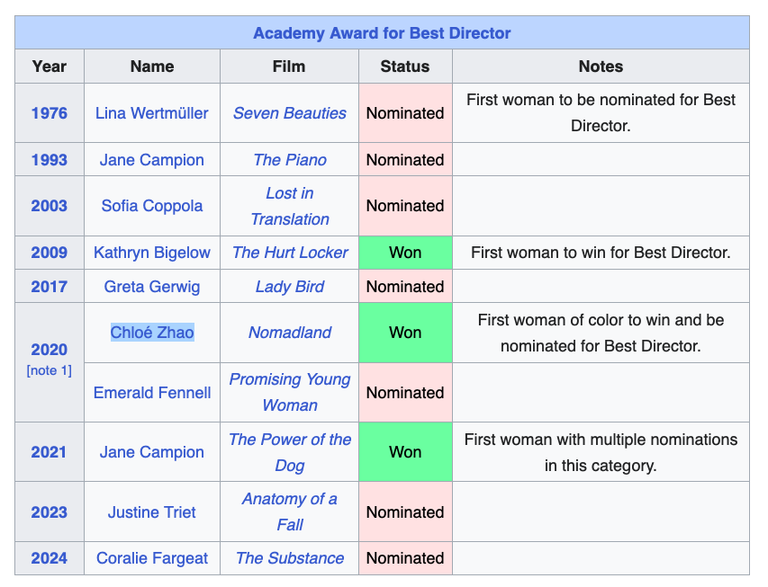 Since 1976 when the first woman was nominated for the category, there have been a total of ten nominations, with Bigelow the first to win in 2009 for the Hurt Locker, followed by Chloé Zhao in 2020 for Nomandland & Jane Campion for Power of the Dog...