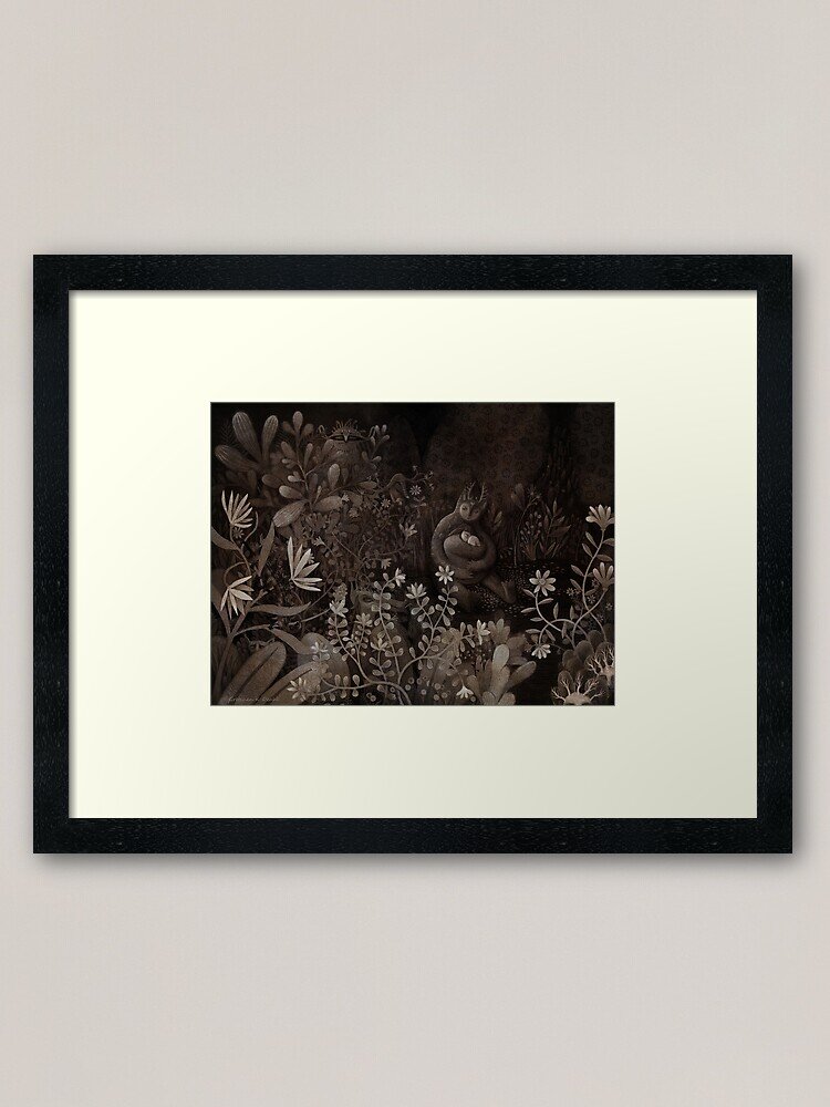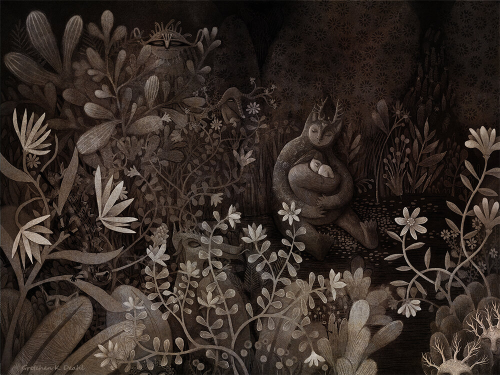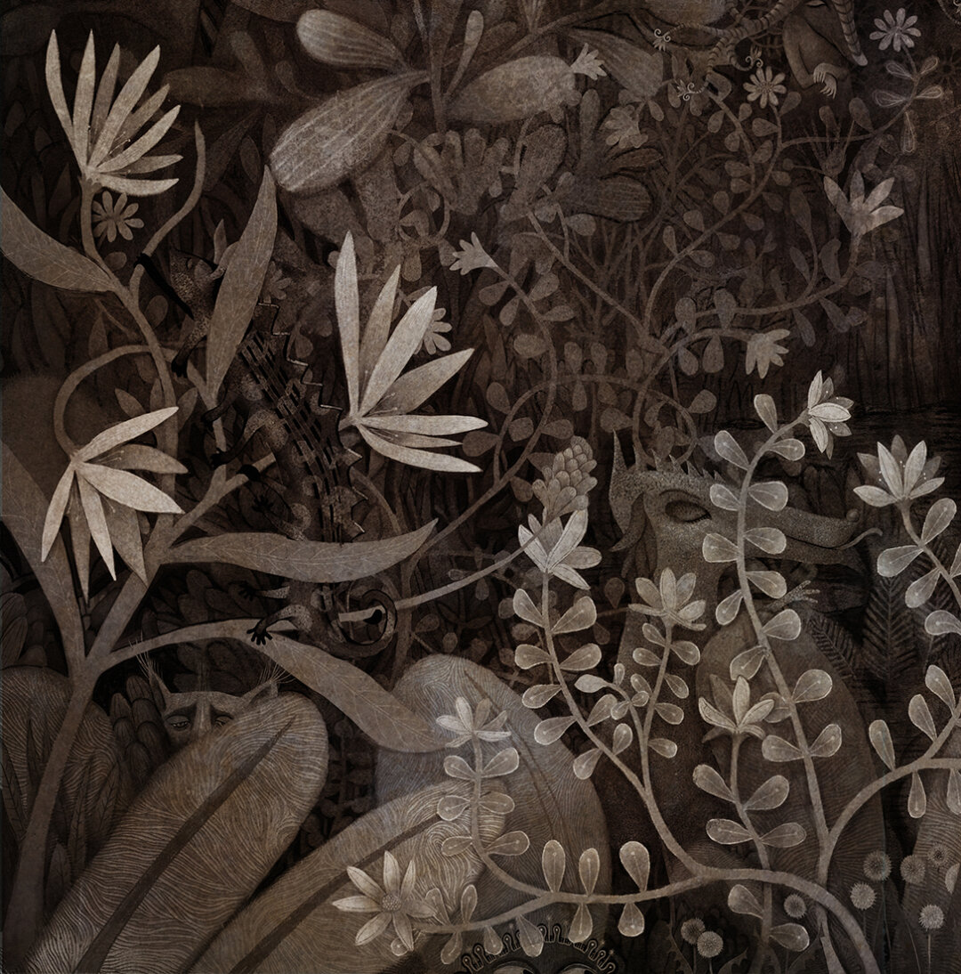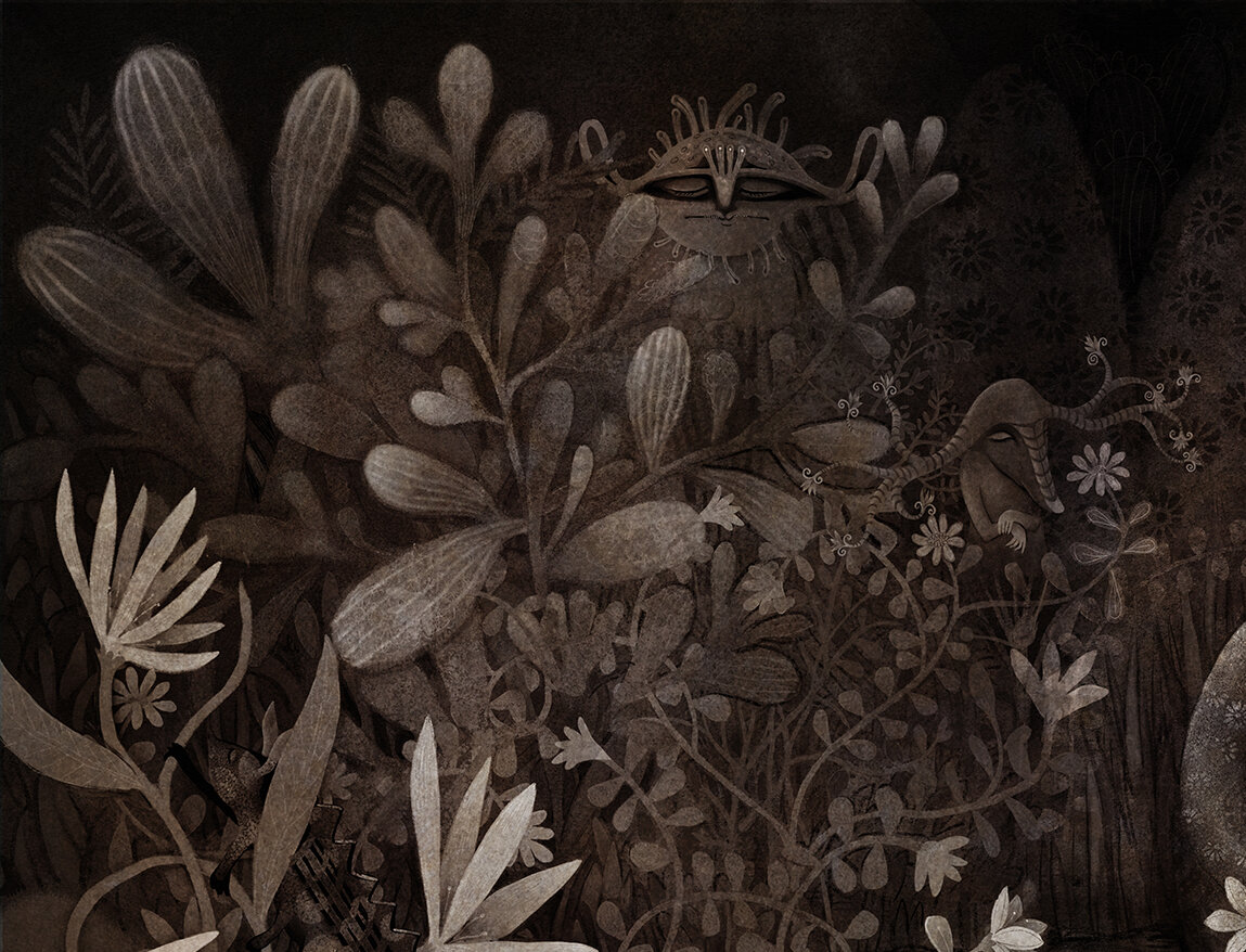 Graphite, colored pencil, watercolor washes and textures. In a limited palette of sienna, a highly textured image of a strange flowering place. Within its space, various beings sleep and dream in the foliage. (Full Image)