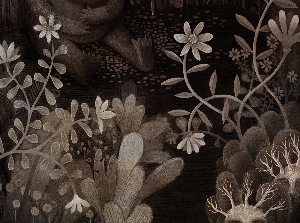 Graphite, colored pencil, watercolor washes and textures. In a limited palette of sienna, a highly textured image of a strange flowering place. Within its space, various beings sleep and dream in the foliage. (Partial Image-enlarged)