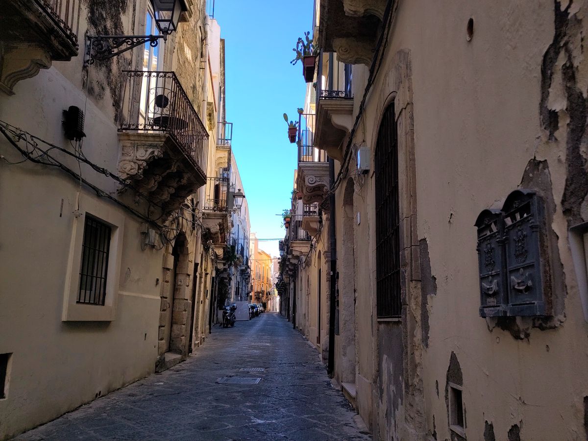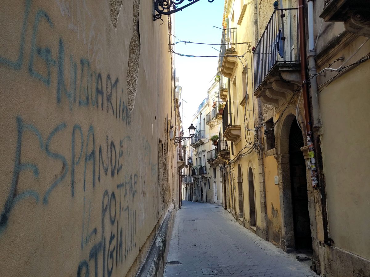 A narrow galley kitchen featuring sage green cabinets and drawers along the right wall, with warm beige tile flooring and backsplash. A vintage-style stove sits on the left, while the right side includes a stainless steel sink and upper cabinets with glass fronts displaying cookware. A simple wooden chair sits at a small desk area beneath a window at the far end. A spherical pendant light hangs from the ceiling, and a doorway on the left leads to another room. The space has a mid-century modern aesthetic with its muted color palette and clean lines