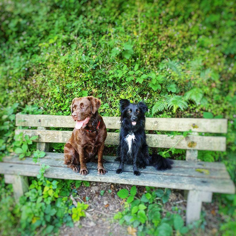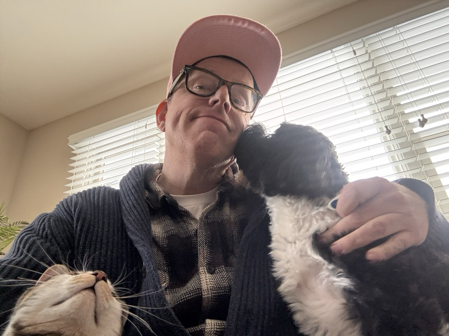 I took a break from work and got buddy-sandwiched by Bill and Roy. They get along great now. #dogsofmastodon #catsofmastodon