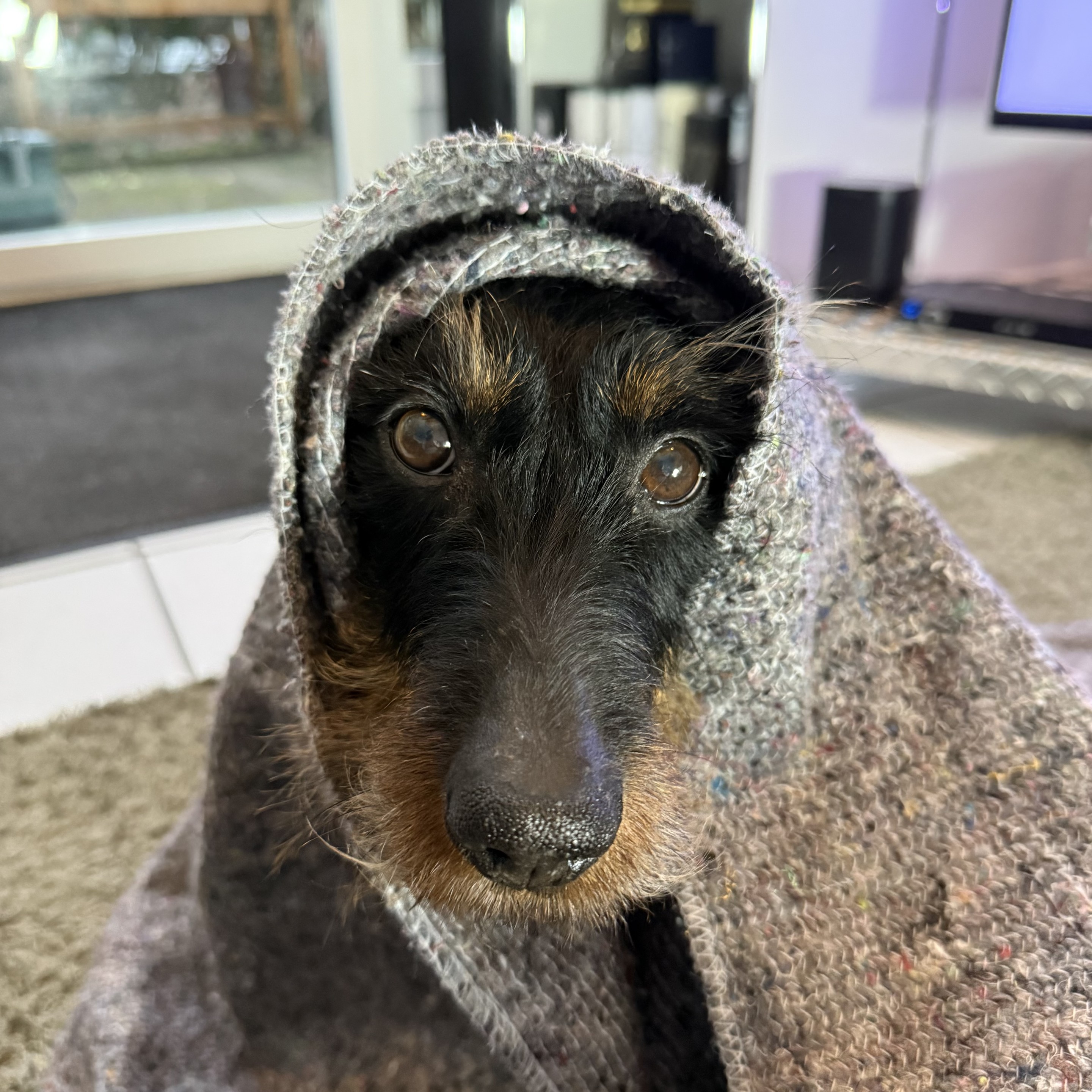 My #Airedoodle is all cosy next to my desk. #DogsOfMastodon #AiredoodlesOfTheFediverse #OliveTheAireDoodle #doodlesofmastodon