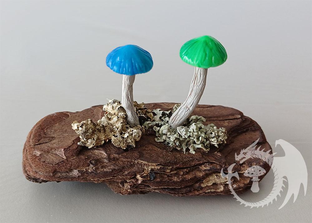 Two small mushrooms I sculpted, "growing" on a brown tree bark. The stems are white and adorned with lichen at the base. One of the mushroom caps is blue, the other green. The background is a very light gray.
