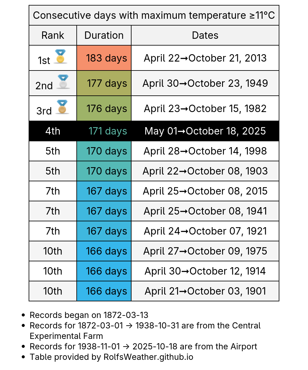Today is #Ottawa's 171st consecutive day with maximum temperature ≥11°C which puts this run in 4th place for the longest run on record. #YowWx #OttWeather #YOW #ONWx