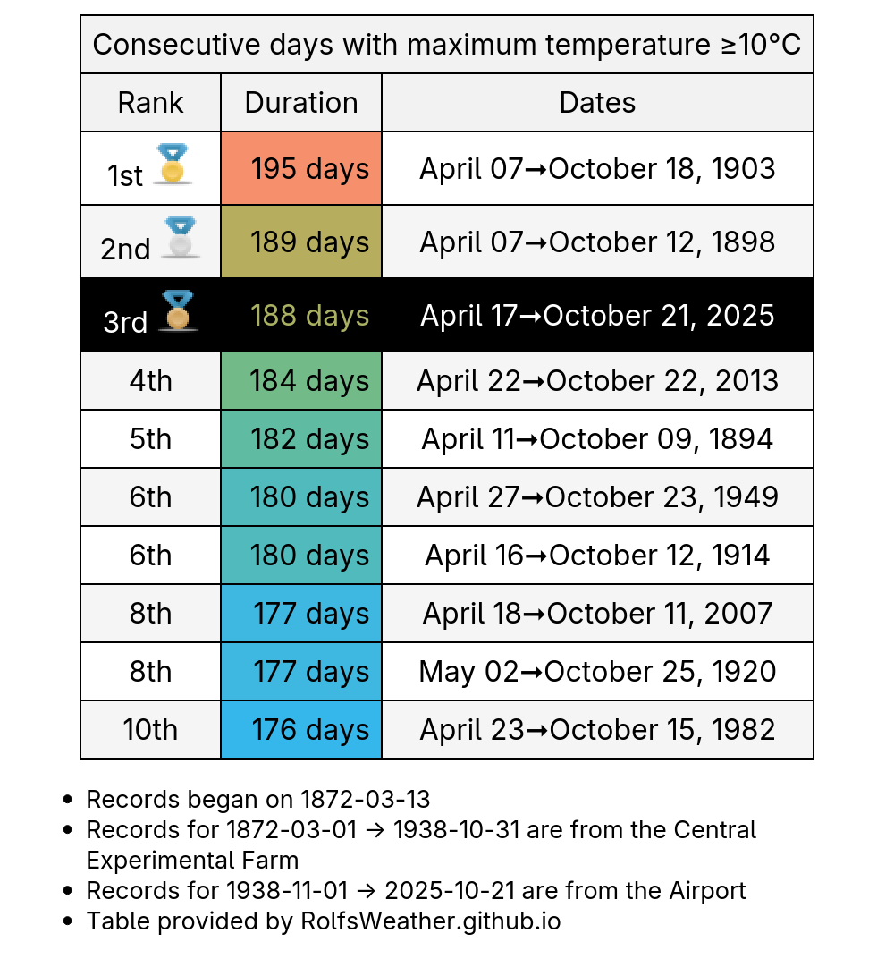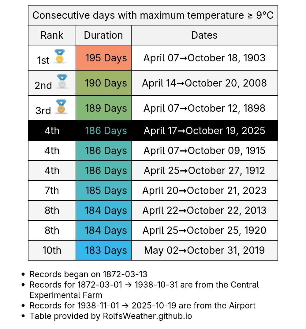 Today is #Ottawa's 186th consecutive day with maximum temperature ≥9°C which puts this run in 4th place for the longest run on record. #YowWx #OttWeather #YOW #ONWx