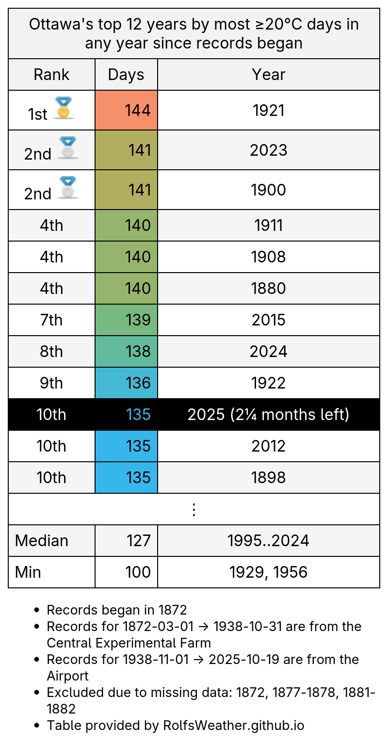 Today is #Ottawa's 135th ≥20°C day this year which raises 2025 from 12th to 10th place for the most in any year since records began. Just 1 more day to get to 9th place. #YowWx #OttWeather