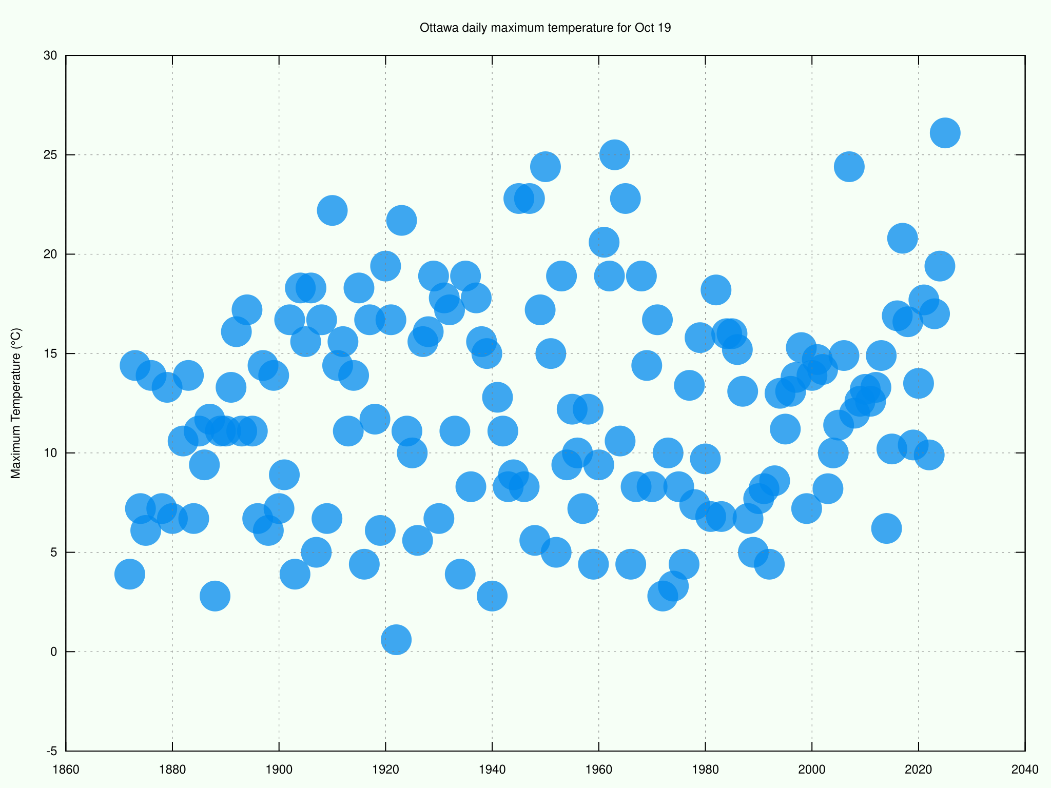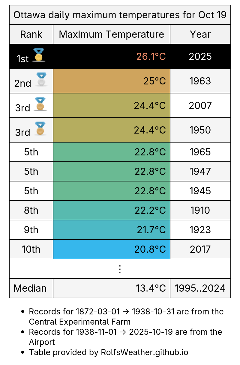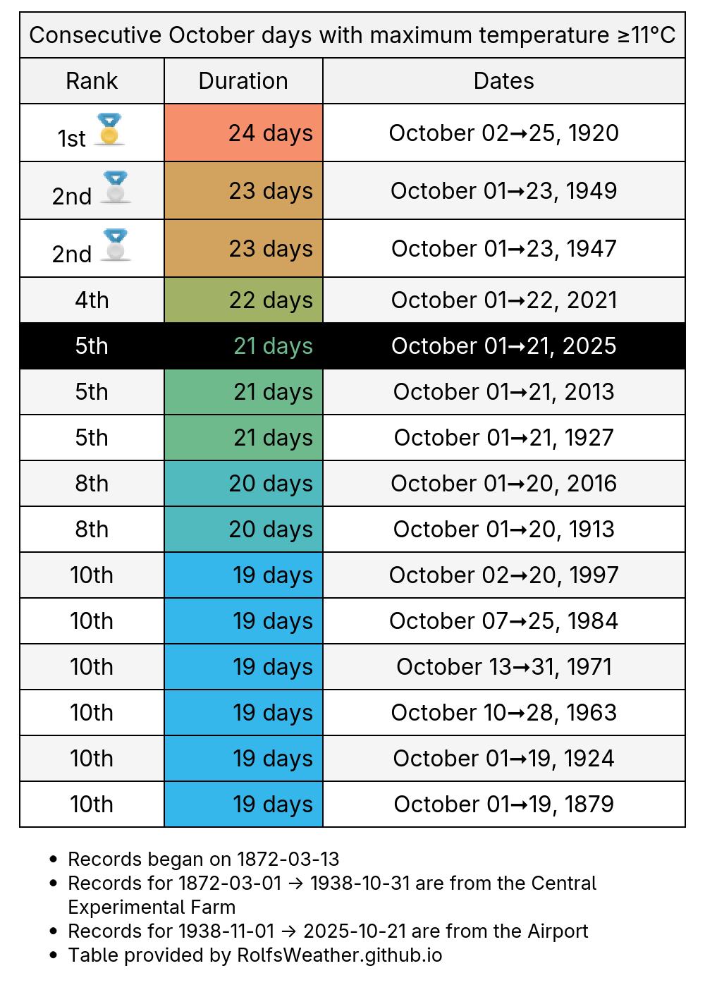 Today is #Ottawa's 21st consecutive October day with maximum temperature ≥11°C which puts this run in 5th place for the longest run on record. #YowWx #OttWeather #YOW #ONWx