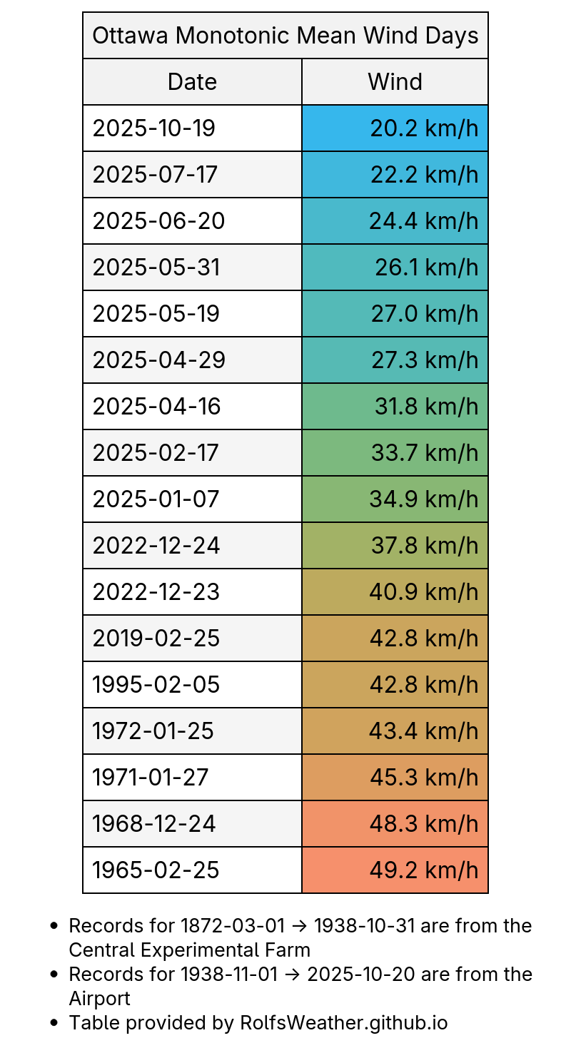 With a mean wind of 20.2km/h, yesterday was #Ottawa's windiest day since Jul 17th. #YowWx #OttWeather