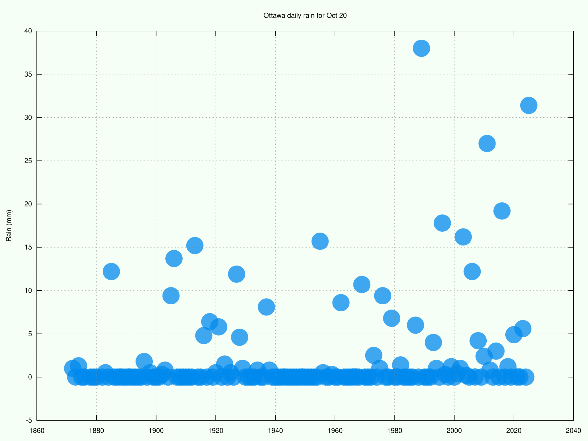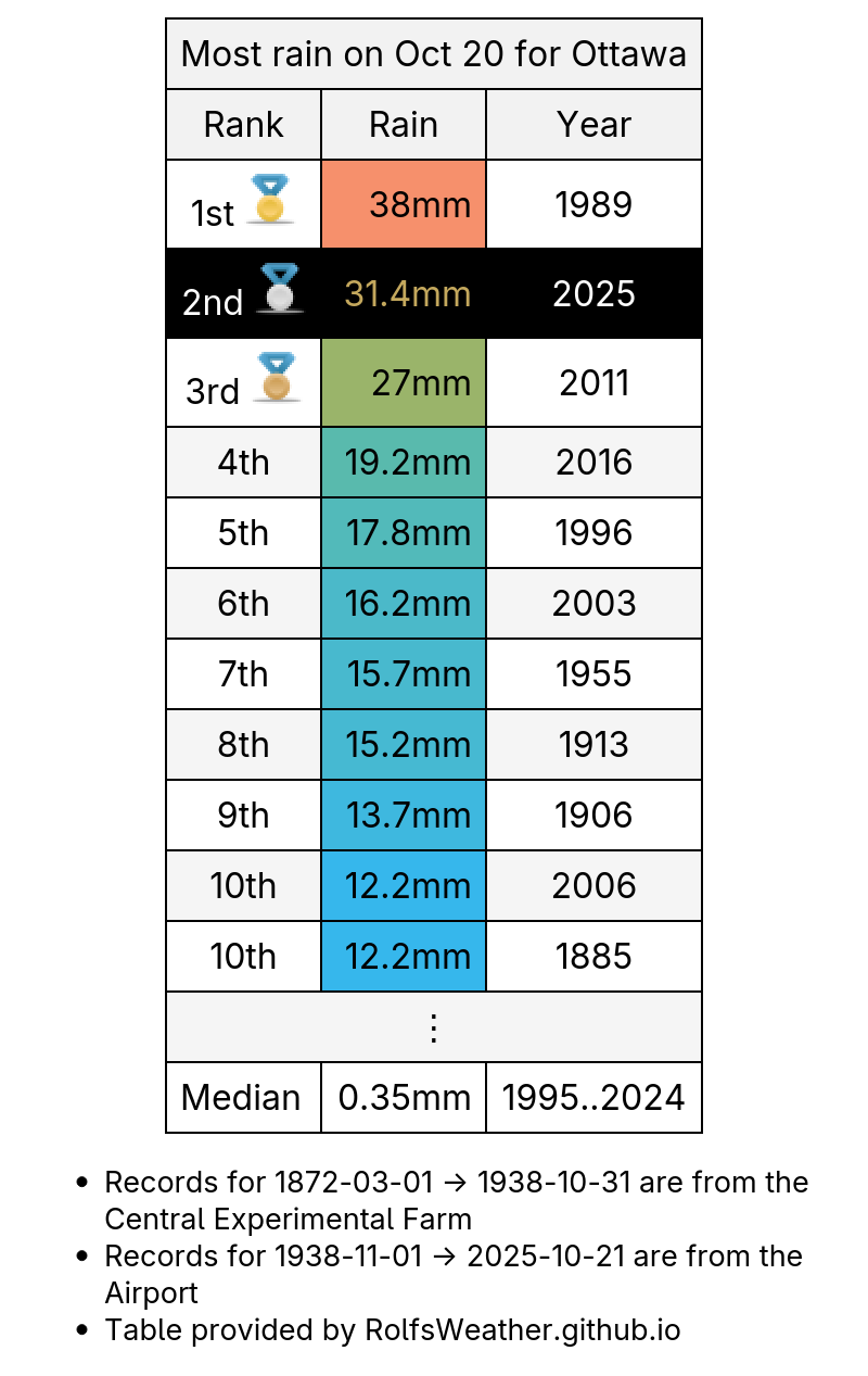 Near record rain. 31.0mm of rain brought #Ottawa within 7.0 mm of the most rain recorded on Oct 20th. #YowWx #OttWeather