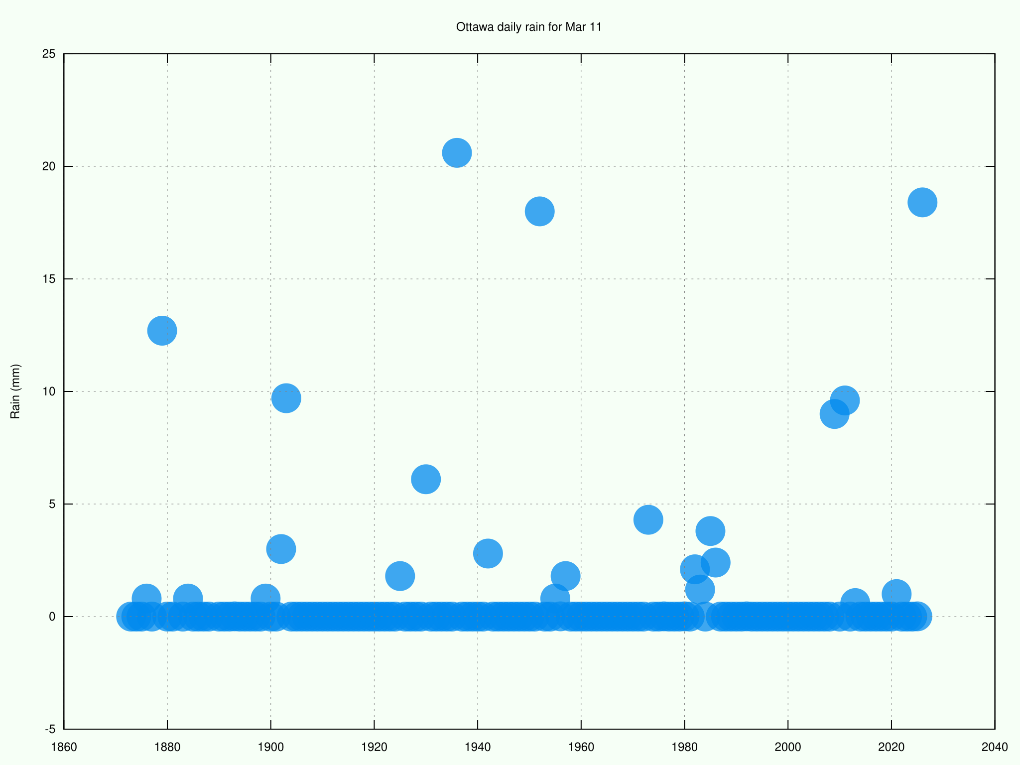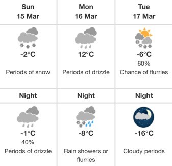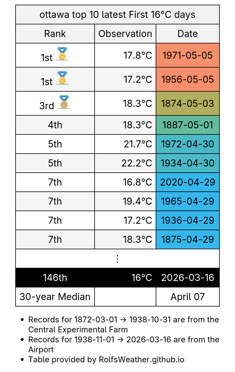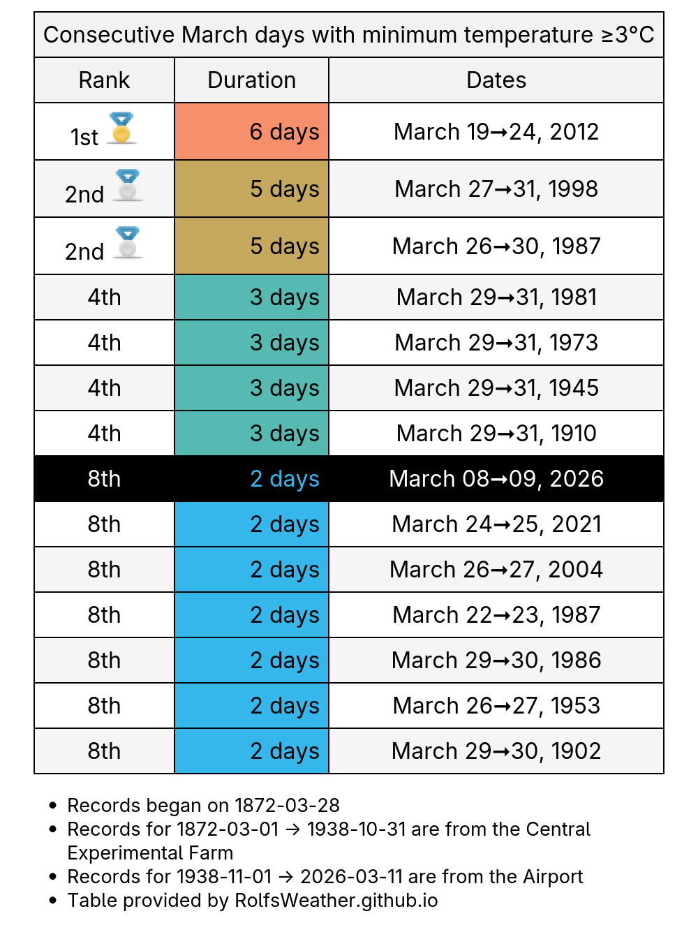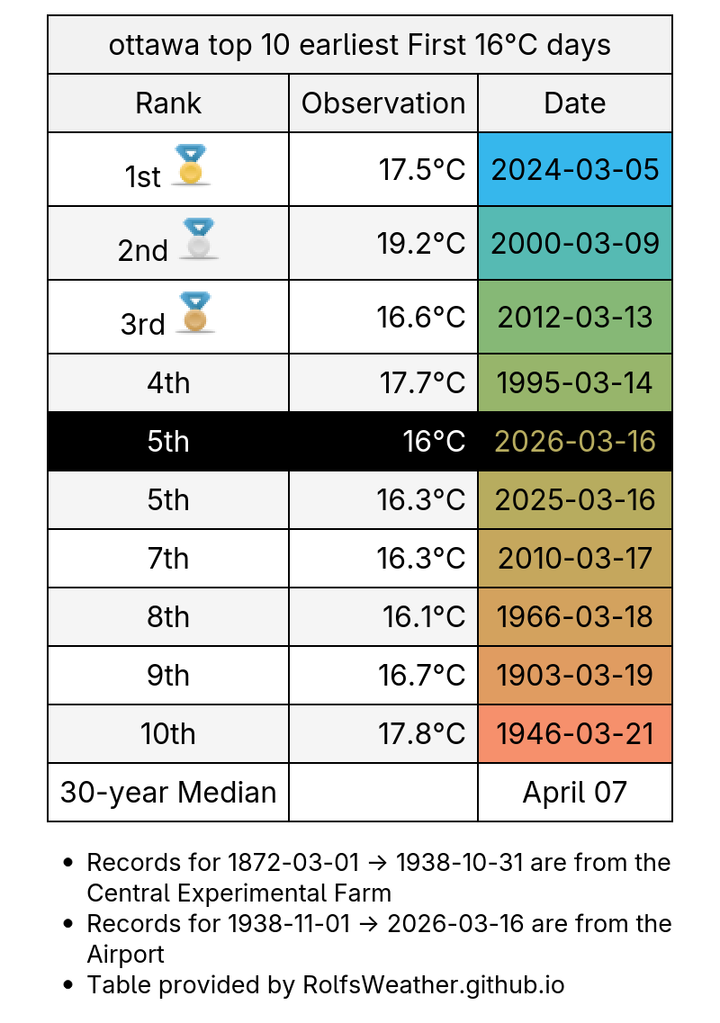 Streak over. After 2 consecutive March days with minimum temperature ≥3°C in #Ottawa, the minimum temperature was only 0.3°C yesterday. We made it to 8th place, only 4 days behind the record. #YowWx #OttWeather