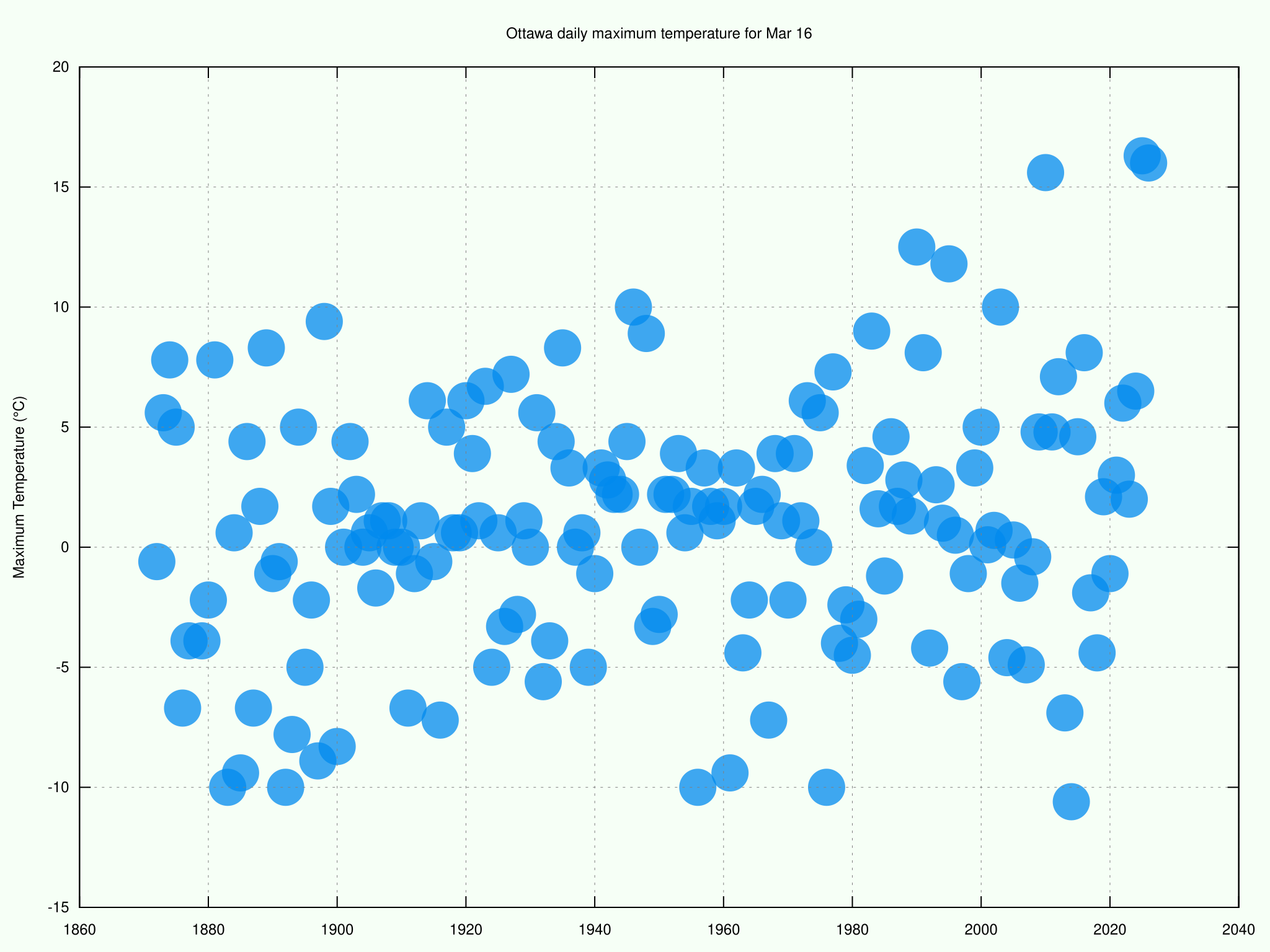 Near record warmth. Today's ~5pm temp of 16.0°C brought #Ottawa within 0.3°C of the highest temperature ever recorded on Mar 16th. #YowWx #OttWeather