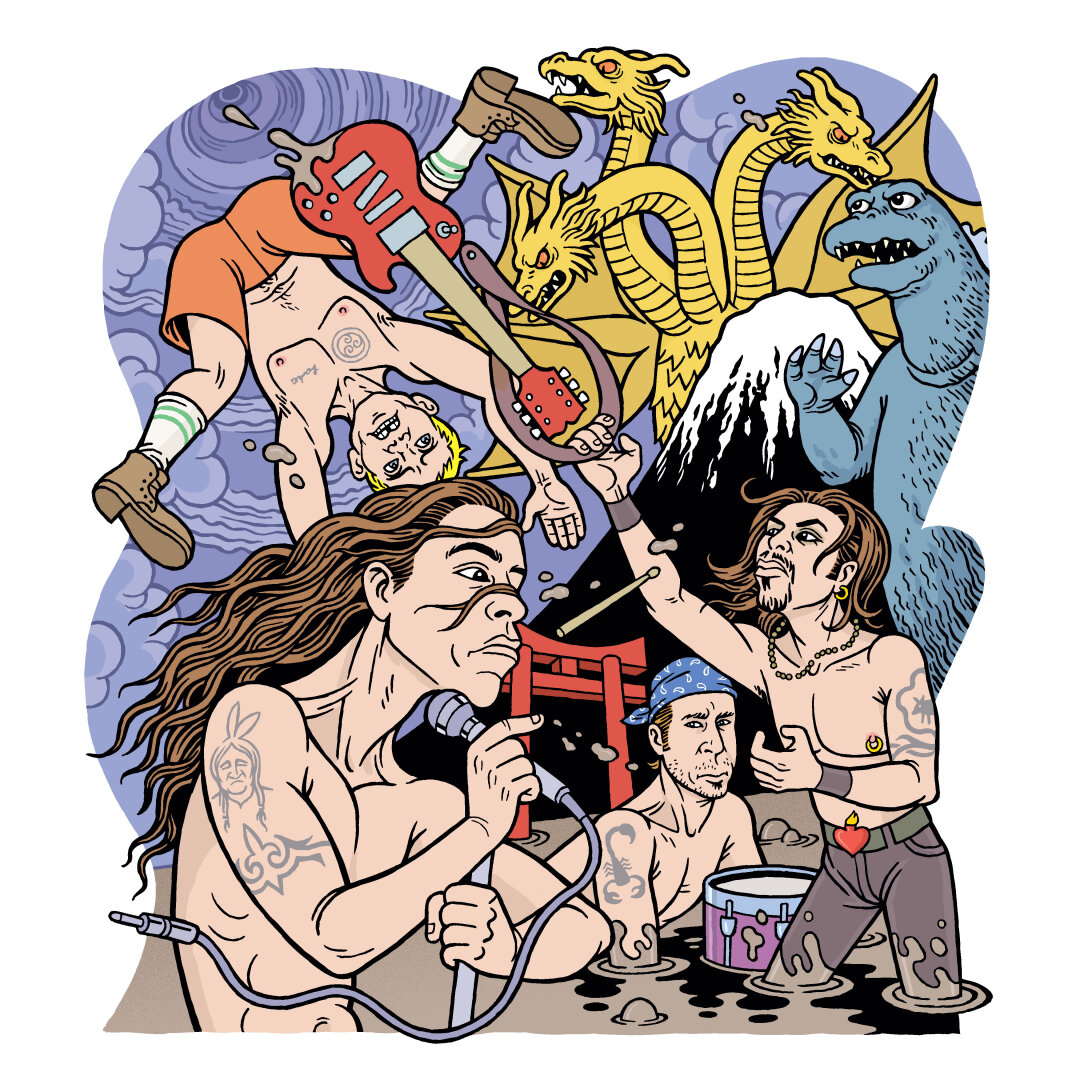 "Red Hot Chili Peppers vs Godzilla," illustration for Tower Records' PULSE Magazine by Danny Hellman, 8/28/97