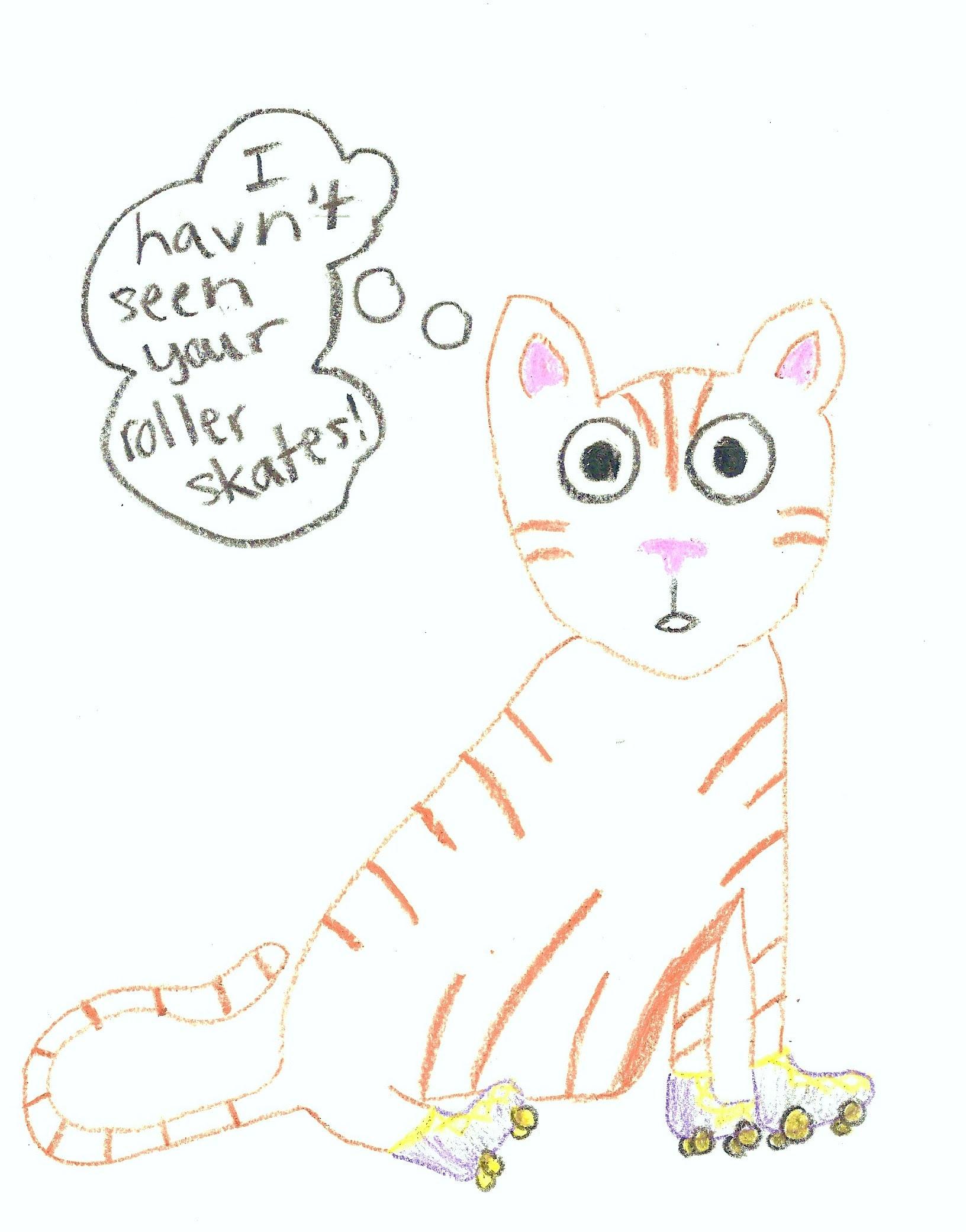 A child's drawing in crayon on white paper of an orange tabby cat wearing purple and yellow roller skates. The cat is not skating, just sitting there. A thought balloon above the cat reads, 'I havn't [sic] seen your roller skates!' The cat appears indignant and slightly offended.