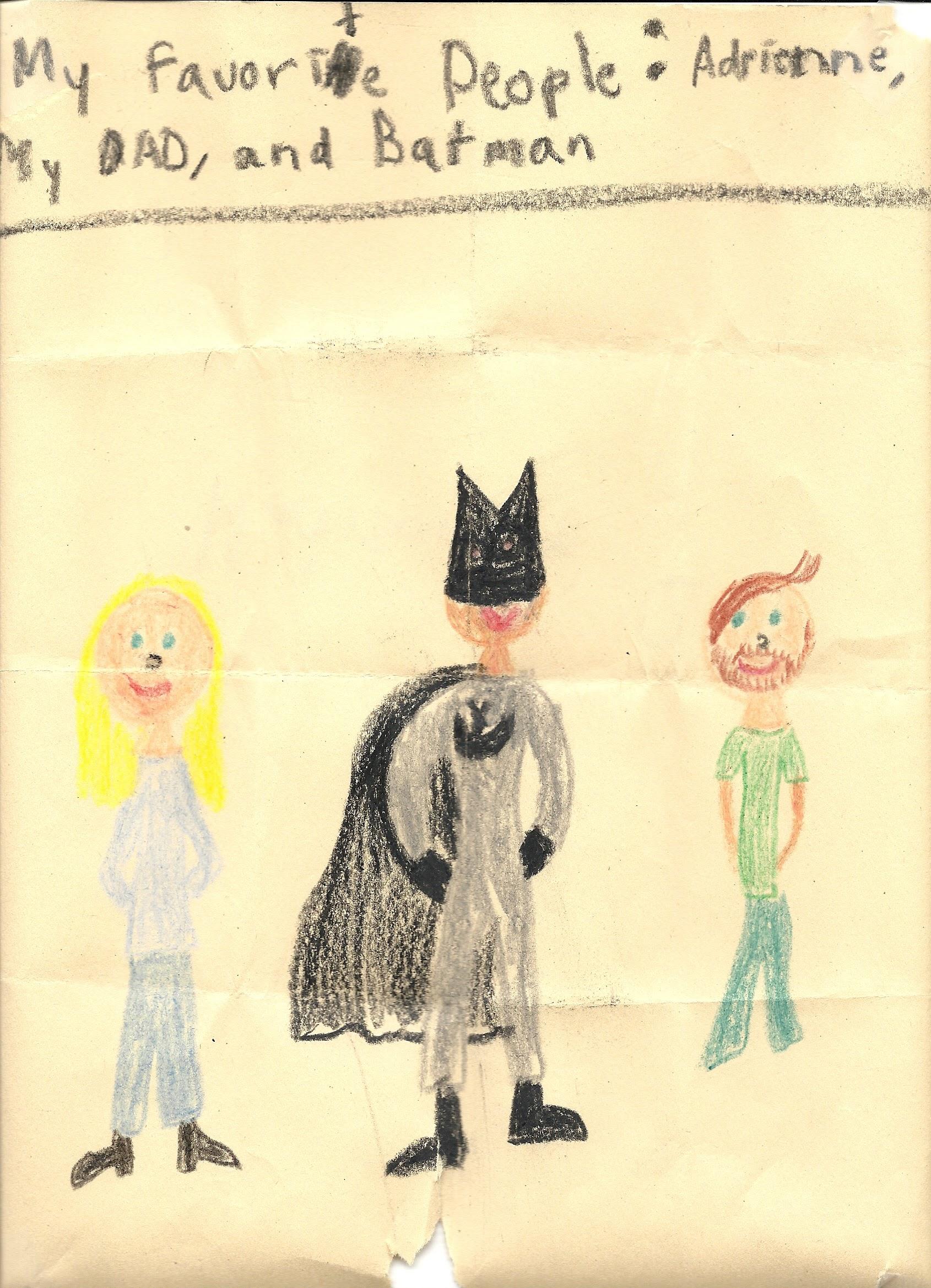 A child's drawing in crayon on butcher paper featuring three poorly rendered figures, from left to right: a woman, batman, a regular man. The woman is drawn with bright yellow hair, a lilac blouse, blue pants and black shoes. Batman is dressed in his usual crime fighting garb. The regular man is drawn with brown hair, a cowlick, a green shirt, and dark blue pants, and no feet. The regular man is supposed to be me. I don't look anything like that. And I have feet. Why didn't she draw my feet?! At the top of the page, the 'artist' has written the words, 'My favorite People: Adrienne, My DAD, and Batman.'