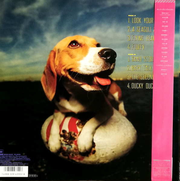 Reverse cover art of album Flying Beagle by Himiko Kikuchi. It shows a beagle sitting on what looks like a white, football-shaped buoy with a red logo partially obscured by the paws of the dog. The beagle is shows in half-profile turned toward its left and looking upward, with mouth partially open and tongue slightly extended. It appears content. The beagle has white, brown, and black fur. The background shows a dark foreground under a slightly light, partly cloudy sky (either sunset or sunrise, it is unclear).