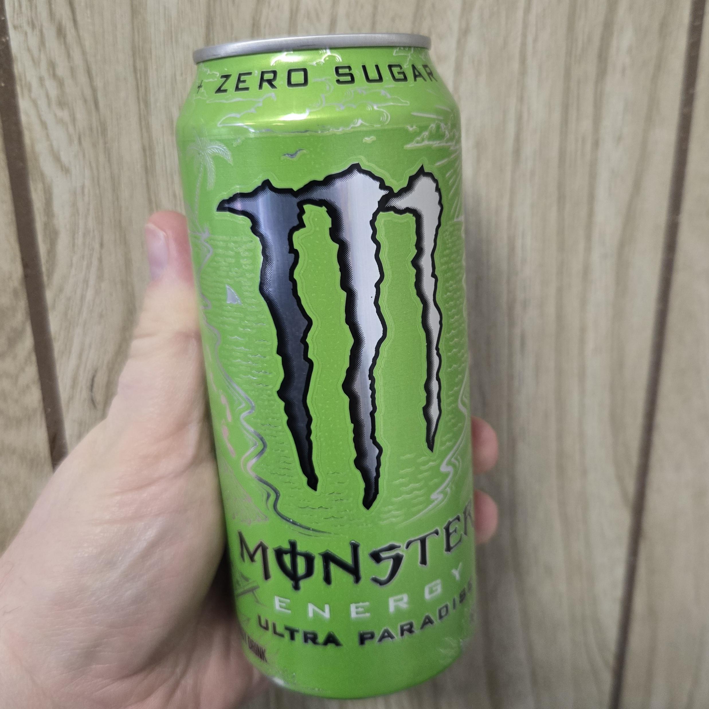 White person's hand holding a can of Monster Energy Ultra Paradise against a light wooden paneled wall. The can is largely green with a large silver M that is intended to look like three scratch marks at the center.