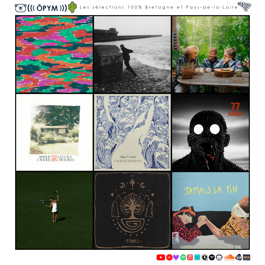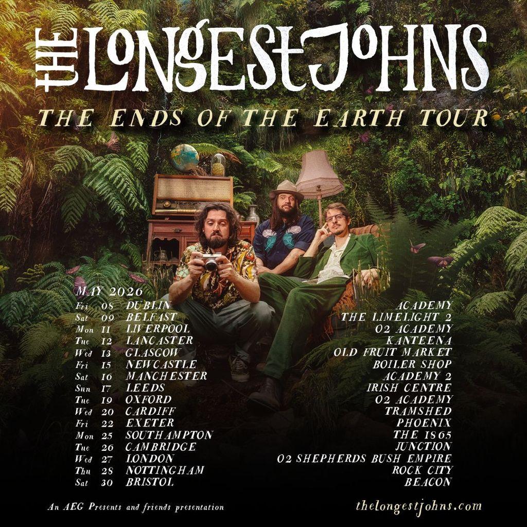 A poster for the upcoming 'Ends of the Earth' tour from The Longest Johns. It shows Robbie, Andy, and JD arranged against a luscious verdant backdrop of tropical-looking foliage. Robbie is crouched down in a colourful shirt, holding a camera. Andy has a hat on and a dark blue shirt with a picture of feathers on it, and JD is wearing a swanky green suit whilst reclining in an armchair. Behind Robbie is what appears to be some kind of wooden cabinet, with an old timey wireless radio on top. There is also a lamp in the background.