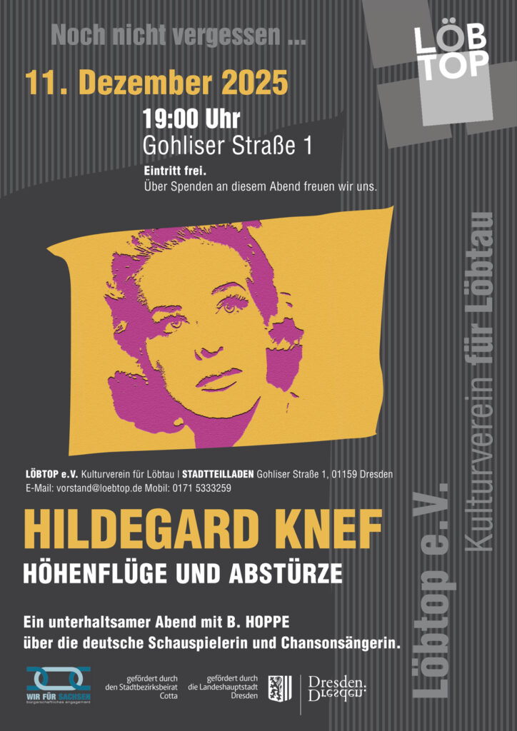 19:00 Uhr | Hildegard Knef (1925 – 2002) Höhenflüge und Abstürze. Ein Clubabend mit Brigitte Hoppe. Herzliche Einladung in den Stadtteilladen.
